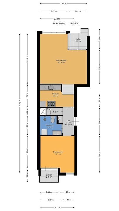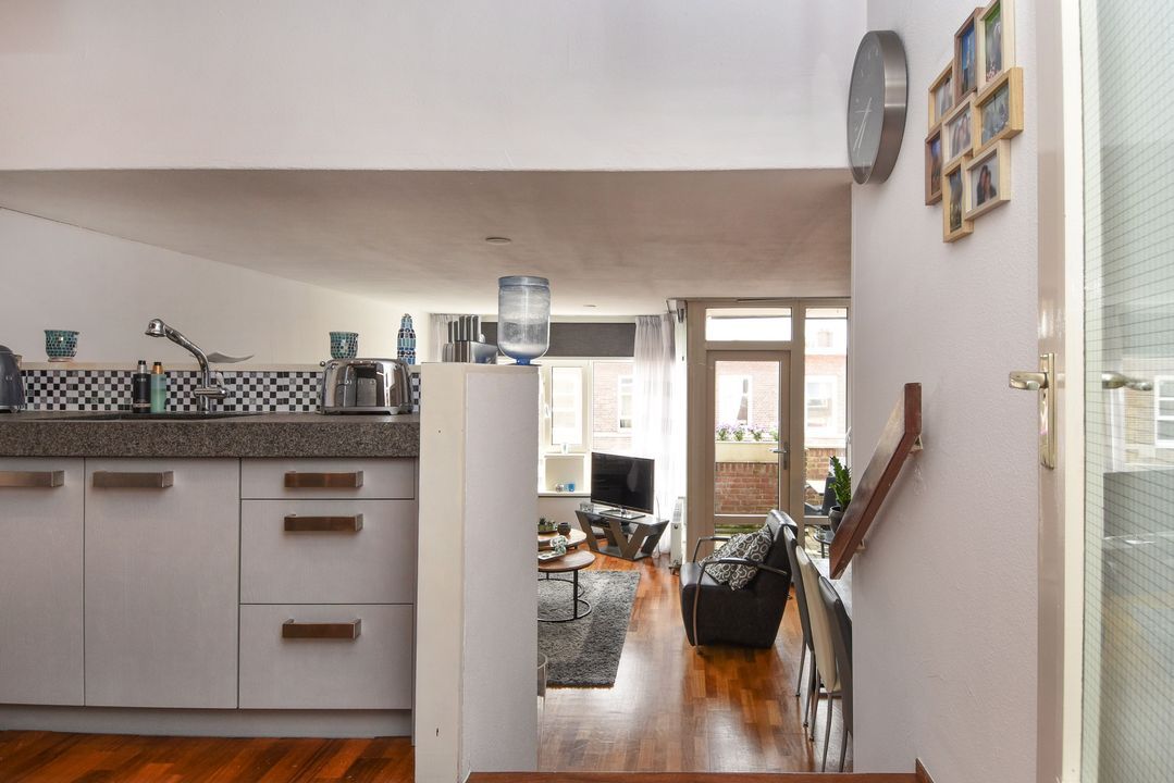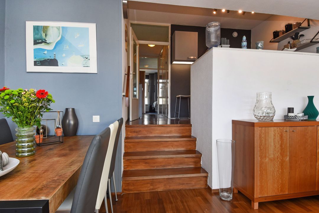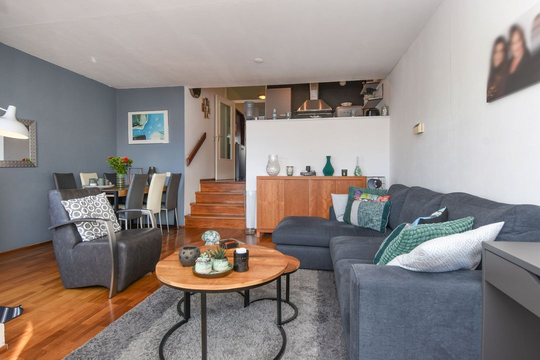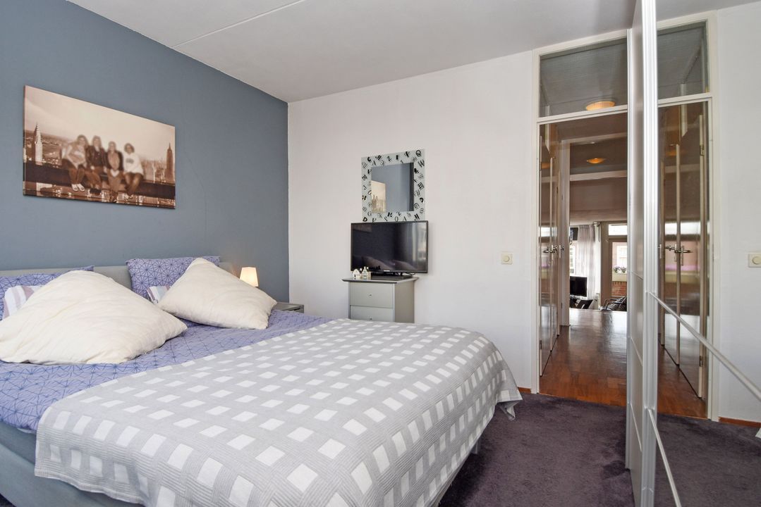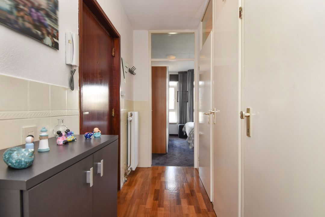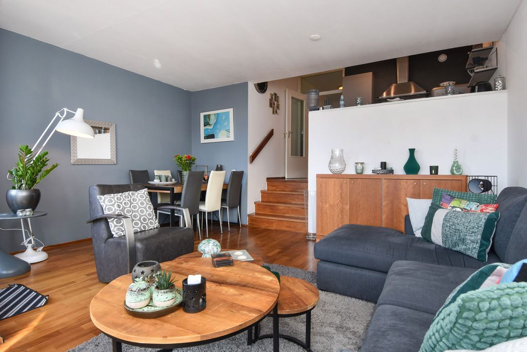 toegang via afgesloten portiekentree; portiektrap naar de 2e verdieping; entree appartement; hal met toegang tot geheel betegelde badkamer ca. 1,85x1,95m voorzien van douche, wastafelmeubel, toilet, handdoekradiator en opstelling wasmachine en droger; meterkast met opstelling elektra (6 groepen + 2x ALS); berging met opstelling cv-combiketel (Remeha Avanta 2019); open keuken ca. 7m2 voorzien van moderne keukeninstallatie met Smegg 6-pits gasfornuis met brede oven, recirculatiekap, vaatwasmachine, losse koelkast en lamelparketvloer doorlopend in de hal; vanuit de keuken via 4 treden naar lager gelegen woon-/eetkamer ca. 25m2 voorzien van lamelparketvloer en toegang tot voorbalkon ca. 3,5m2 op het zuidwesten; achter slaapkamer ca. 12,5m2 met toegang tot achterbalkon ca. 3m2; berging in de onderbouw ca. 5m2.