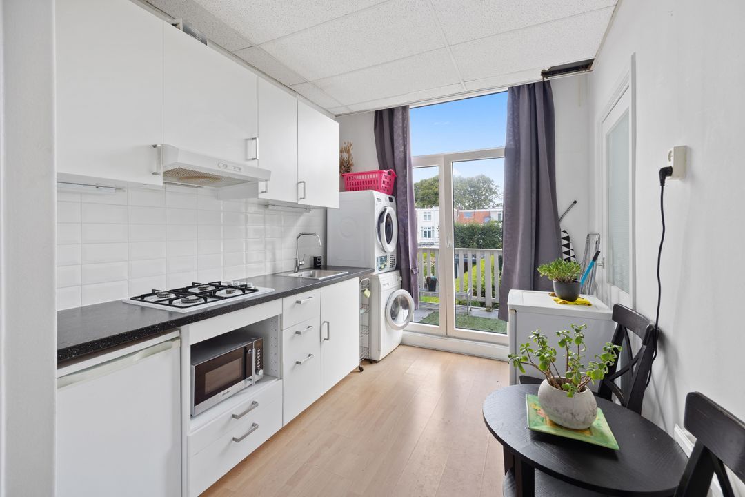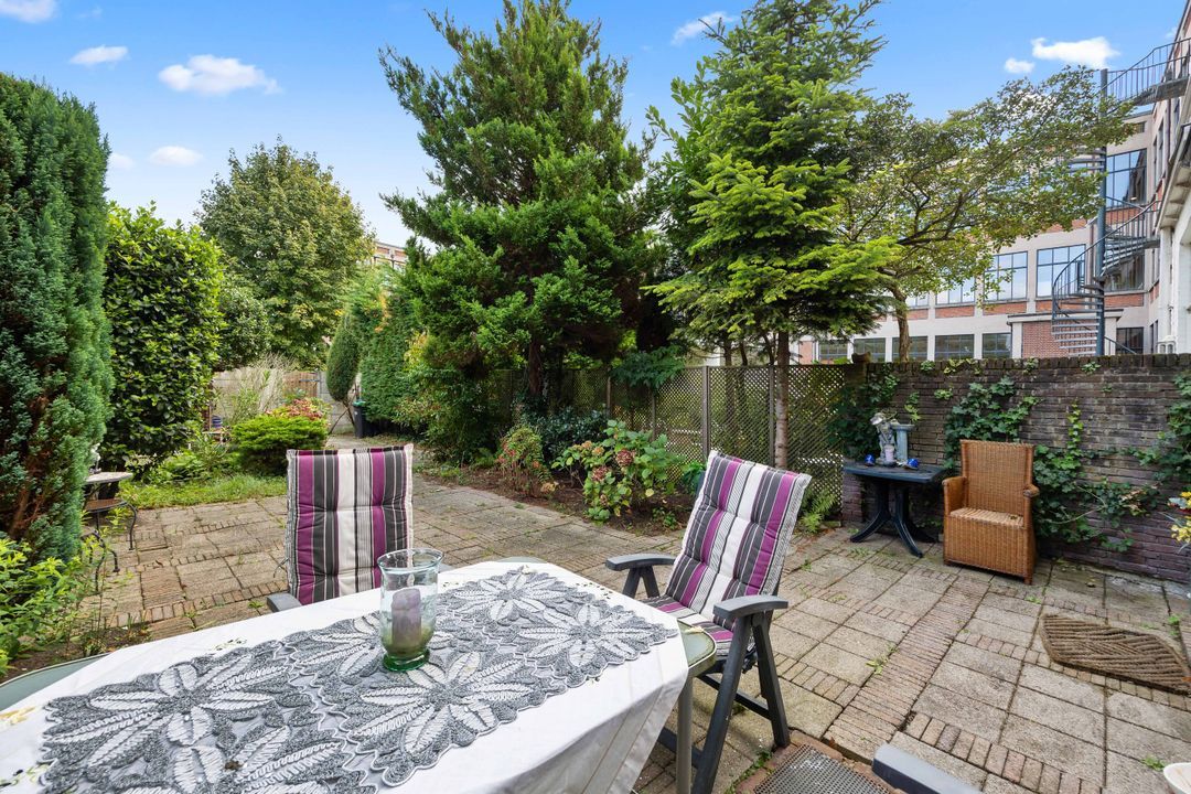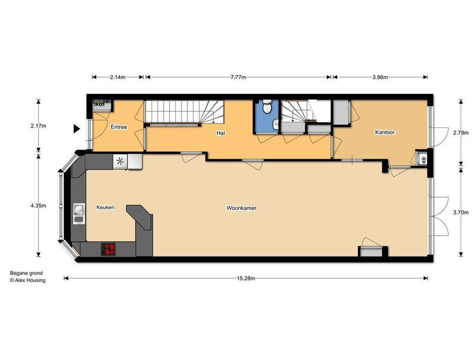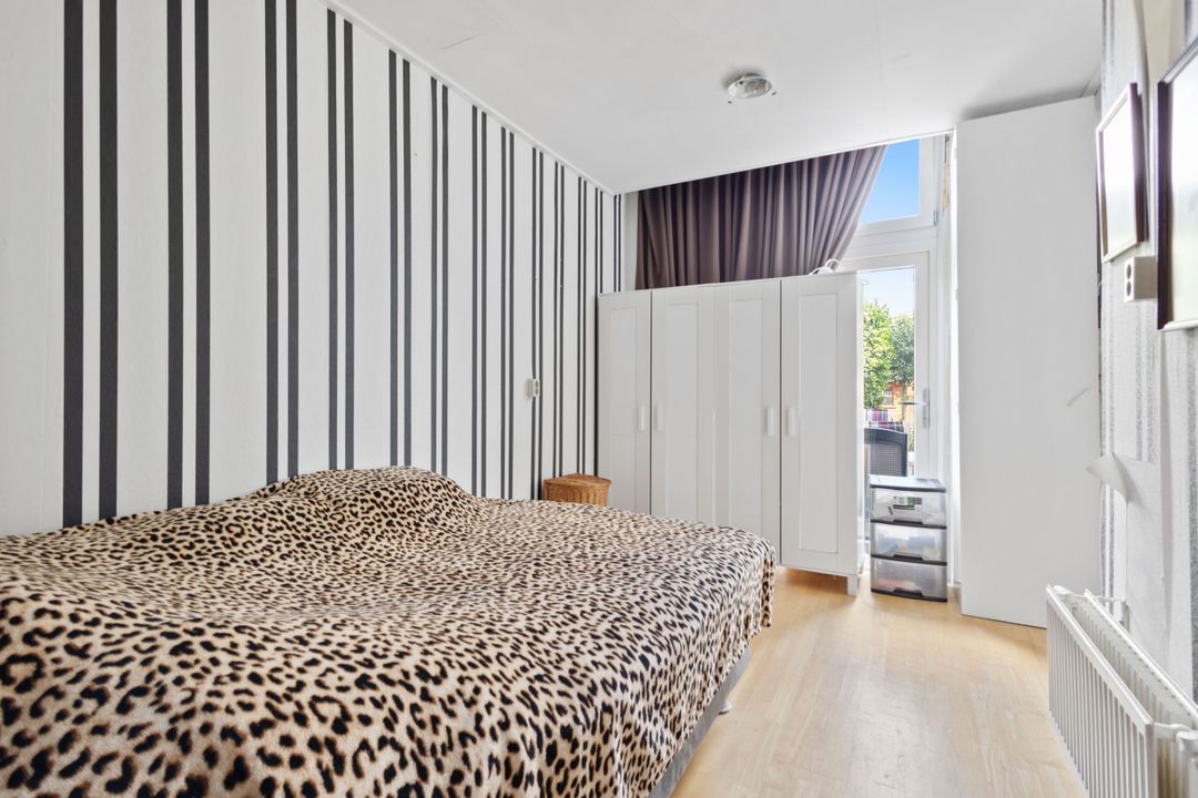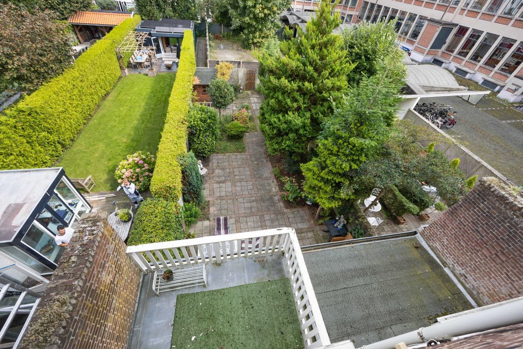 Indeling: toegang via bordes; entree woonhuis; vestibule ca. 2,15x2,15m met meterkast (elektra 15 groepen + ALS) en marmeren vloer en lambrisering; hal voorzien van geheel betegelde toilet-/douchecombinatie ca. 1,35x1,95m voorzien van fontein en mechanische ventilatie; toegang tot kelderruimte ca. 2,25x6,10m voorzien van een wasmachineaansluiting en een stahoogte van ca. 1,85m; voormalige keuken thans slaapkamer ca. 2,15 deels 2,80x3,95m met vaste kast en opstelling CV-combiketel (Intergas HRE Kompakt 2014); zeer royale doorgebroken woon-/eetkamer met open keuken ca. 4,35 deels 3,70x15,30m voorzien van lamelparketvloer, openslaande deuren naar de achtertuin en U-vormige keukeninstallatie aan de voorzijde voorzien van keramische kookplaat, afzuigkap, vaatwasmachine, koelkast, vriezer, combioven, combimagnetron, veel kast- en werkruimte; ca. 17 meter diepe achtertuin op het oosten met houten tuinhuis en achteruitgang.