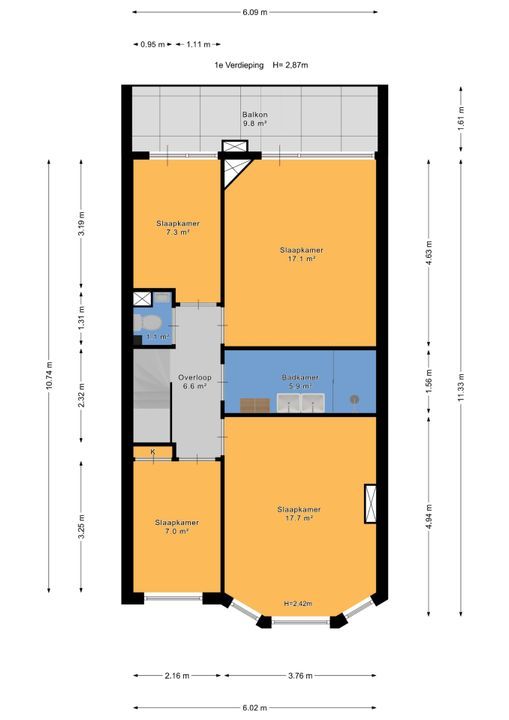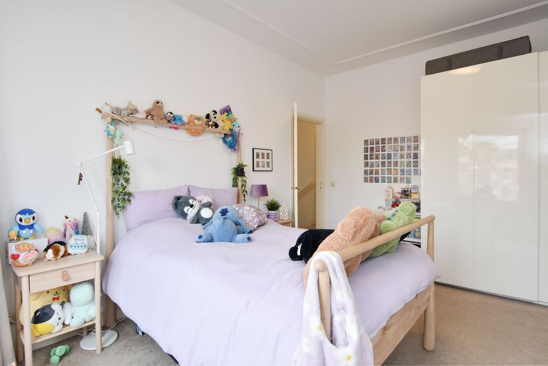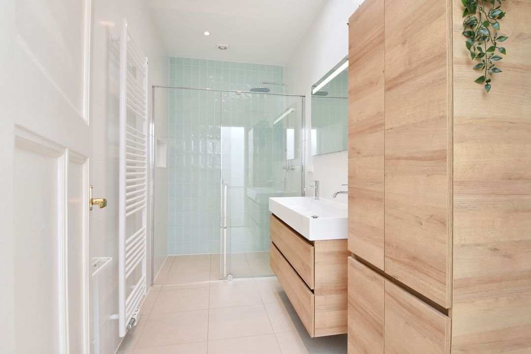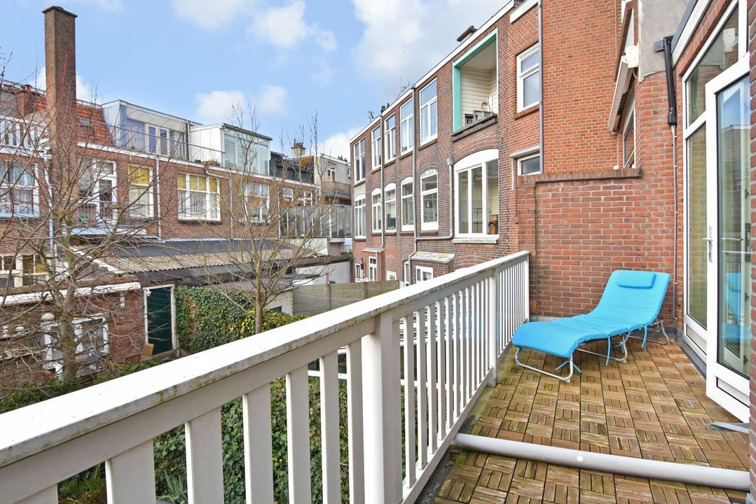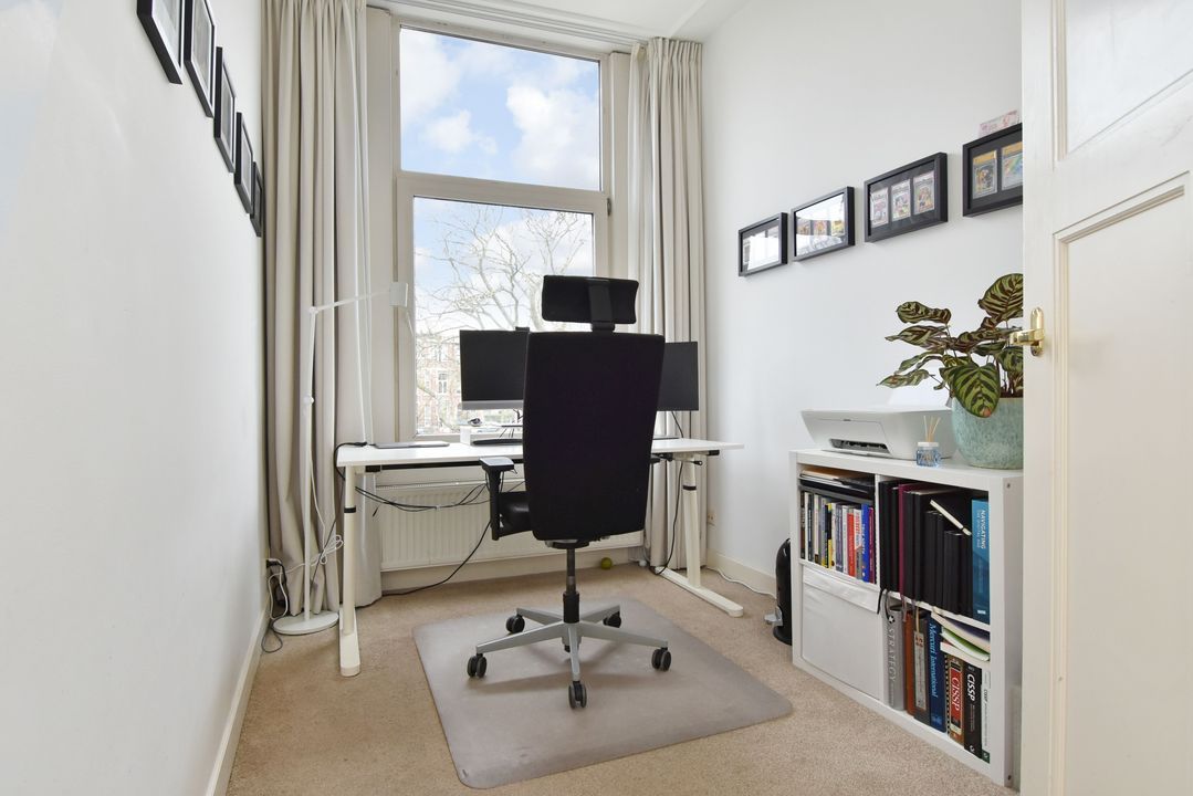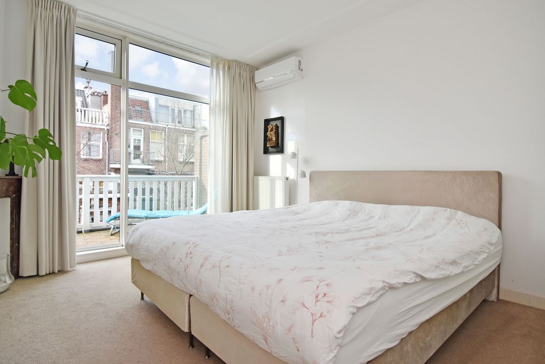 trapopgang naar de 1e verdieping: overloop, betegeld toilet en fontein; voorzijkamer/werkkamer ca. 2,15x3,25m met vaste kast; voor slaapkamer ca. 3,75x4,95m met marmeren schouw, airco-unit en erker; moderne betegelde badkamer (2024) ca. 1,55x3,75m voorzien van een ruime douche met hardglazen schuifdeur, dubbel wastafelmeubel, handdoekradiator en mechanische ventilatie; achter slaapkamer ca. 3,75x4,60m voorzien van een airco-unit en toegang tot achterbalkon over de gehele breedte ca. 1,60x6,10m; achter zijkamer ca. 2,15x3,20m.
