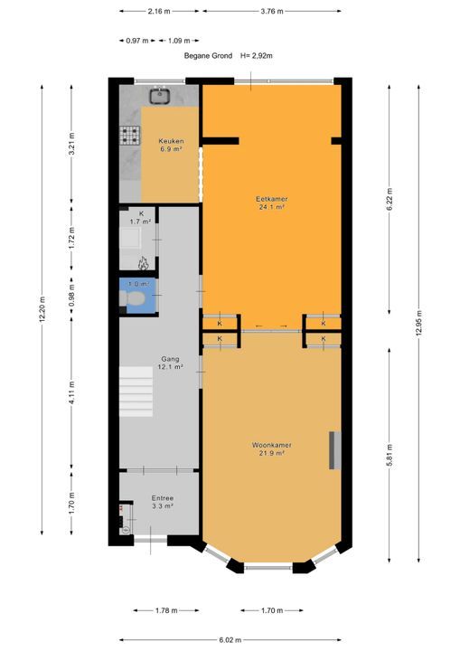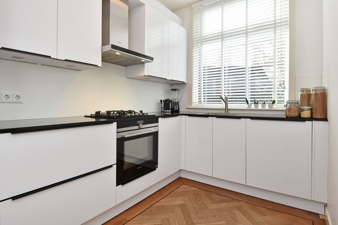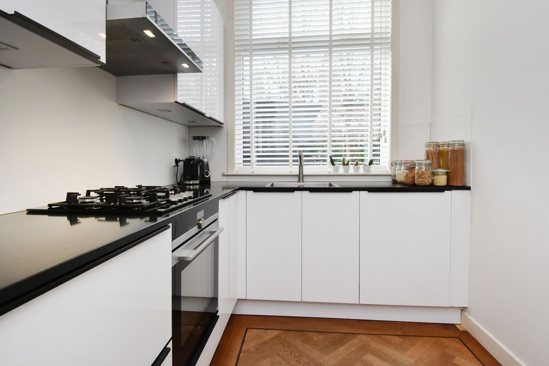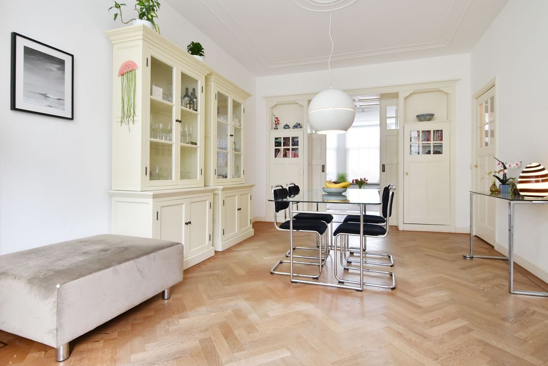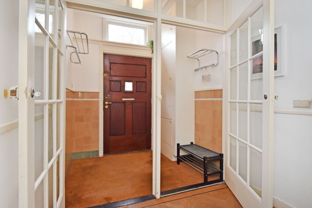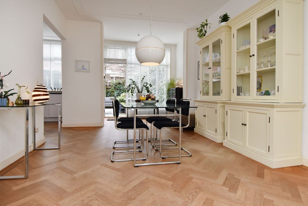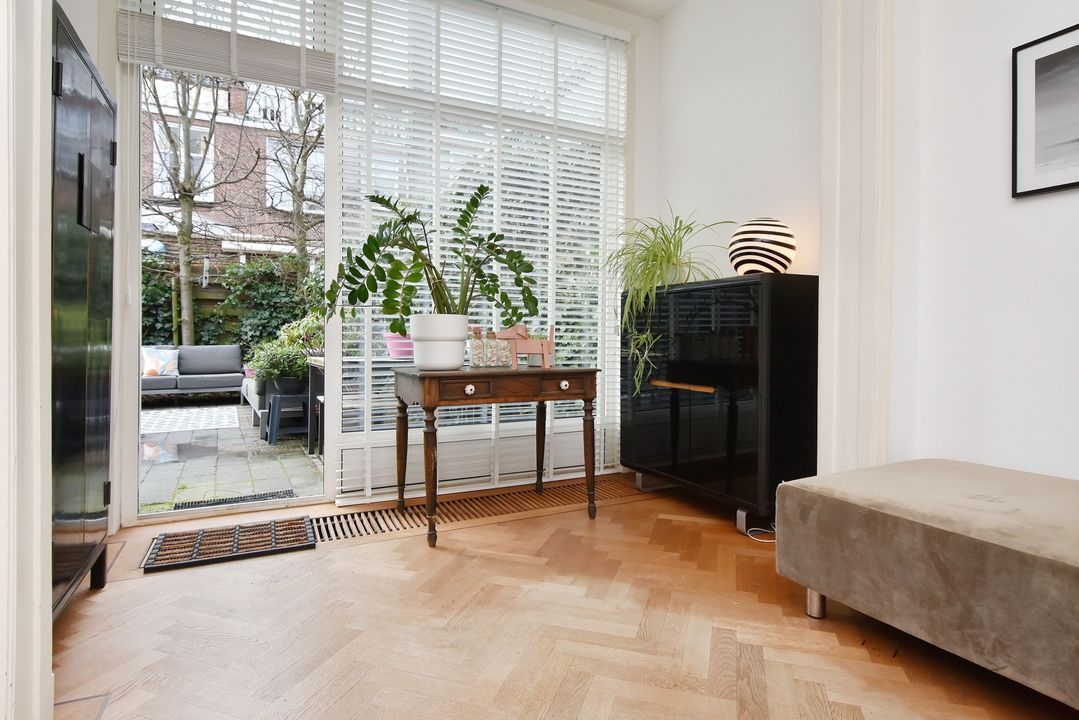 entree op straatniveau; vestibule ca. 1,70x1,80m met meterkast (elektra 11 groepen + 3x ALS + omvormer zonnepanelen) en dubbele deuren naar de hal met bergruimte onder de trapopgang, betegeld toilet met fontein en een betegelde wasruimte ca. 0,95x1,70m met opstelling wasmachine, droger en cv-combiketel (Remeha 2021); voor- en achterkamer ensuite voorzien van schuifseparatie en 4 vaste kasten; voorkamer ca. 3,75x5,80m voorzien van een fraaie Eikenhouten visgraat parketvloer met bies doorlopend in de achterkamer, keuken en de hal, ornamenten plafond, marmeren schouw met open haard en erker kozijn aan de voorzijde; achterkamer ca. 3,75x6,20m voorzien van convectorput, deur naar de achtertuin en doorgang naar half open keuken ca. 2,15x3,20m voorzien van een moderne hoek opgestelde keukeninstallatie (2021) met gaskookplaat, afzuigkap, combioven, vaatwasmachine en koel-/vriescombinatie; achtertuin op het westen ca. 6,30 deels 5,30x 7,25m met houten berging.