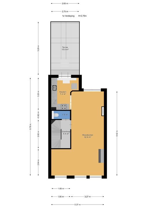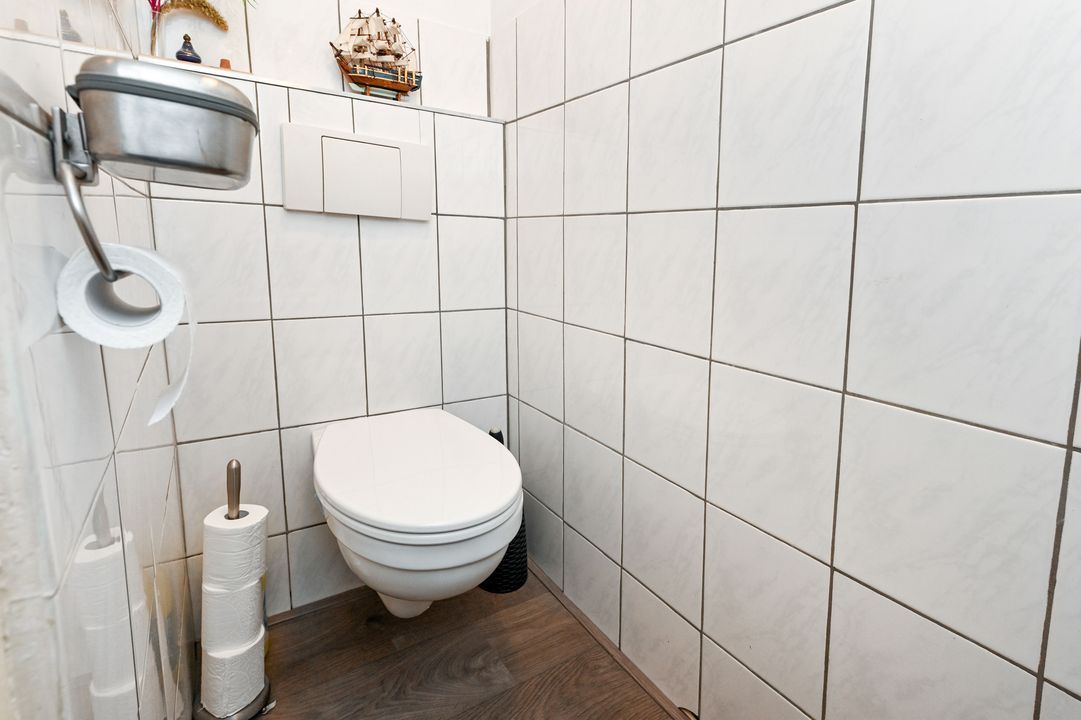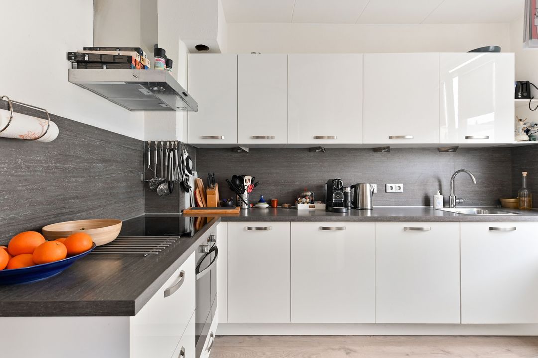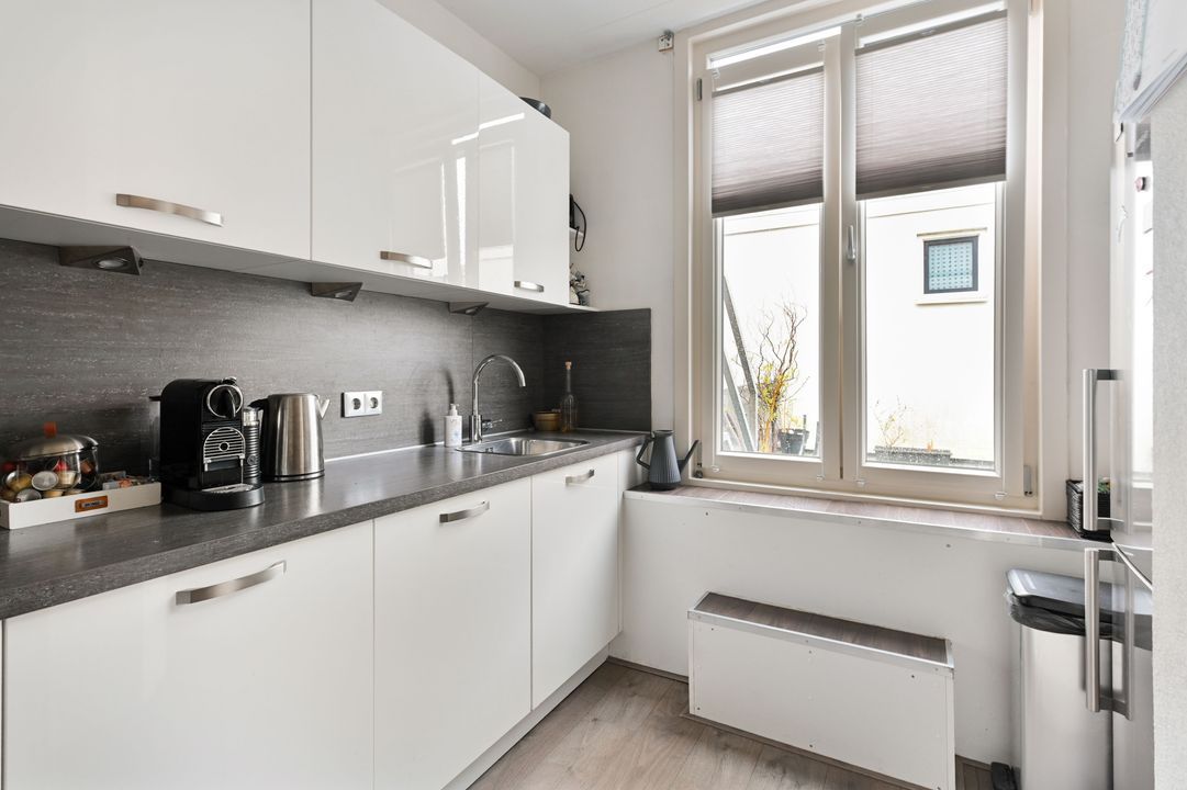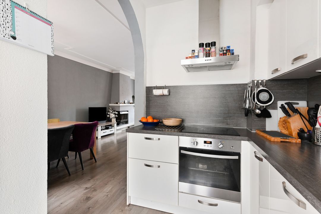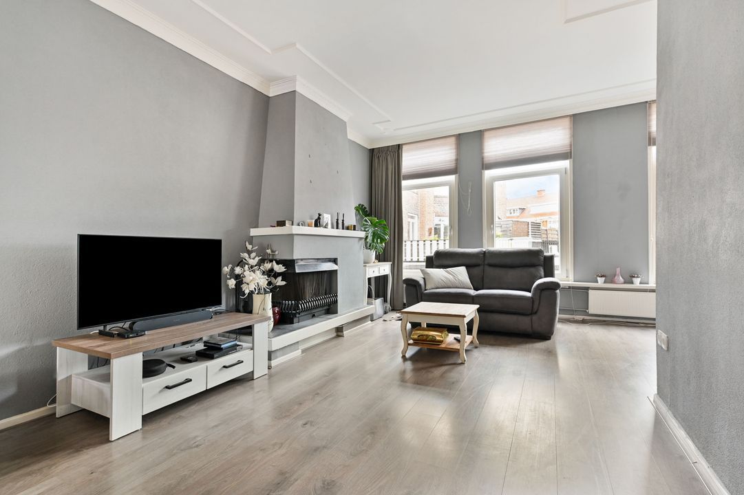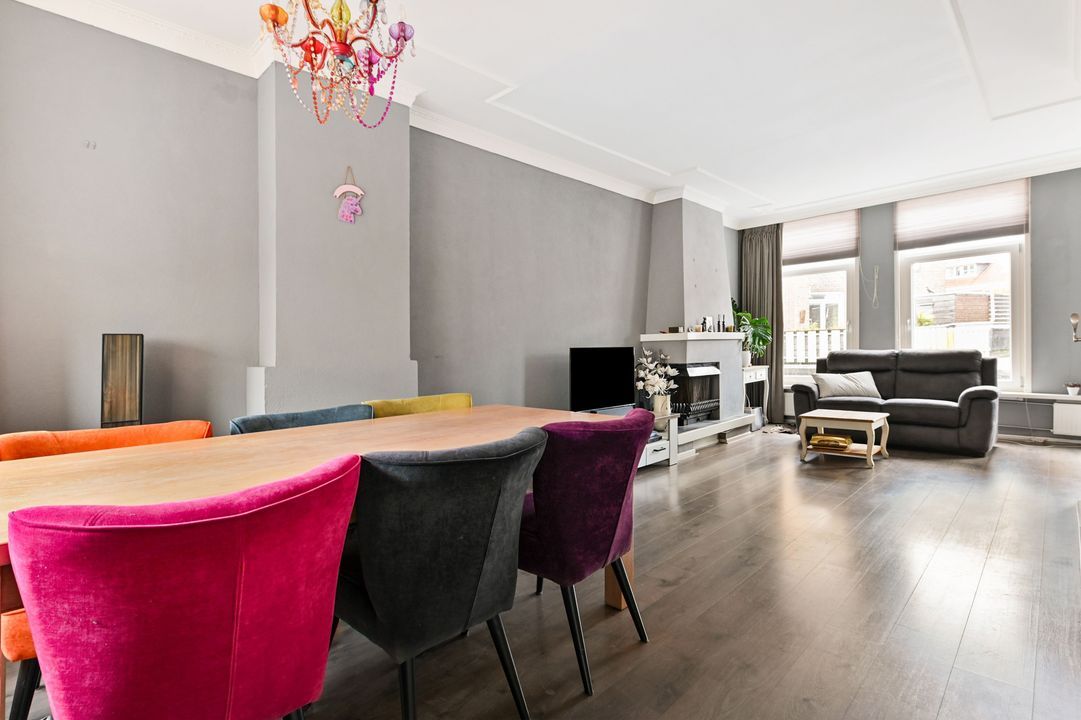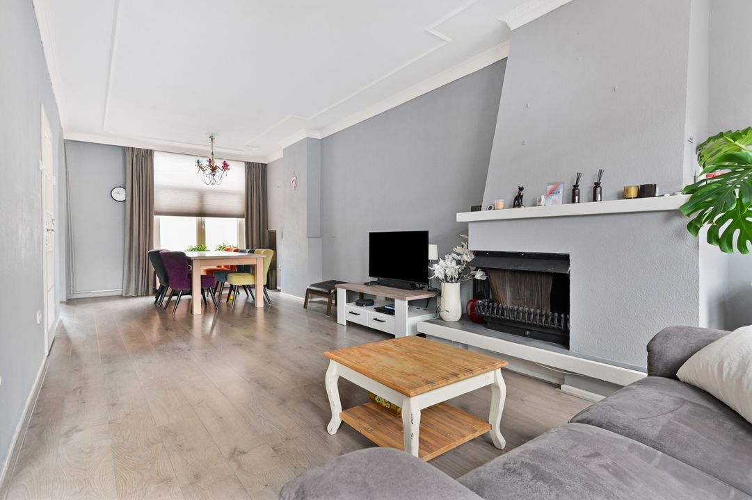 1e verdieping: overloop; betegeld toilet voorzien van vrijdragend closet en mechanische ventilatie; doorgebroken L-vormige woon-/eetkamer ca. 3,25x8,40m en 2,00x2,65m voorzien van laminaatvloer, ornamenten plafond, open haard en via toog toegang tot half open keuken; hoek opgestelde keukeninstallatie (2016) voorzien van inductie kookplaat, recirculatiekap, combioven (stoom), vaatwasmachine en via opstap en openslaande ramen toegang tot dakterras ca. 2,85x4,55m op het oosten.