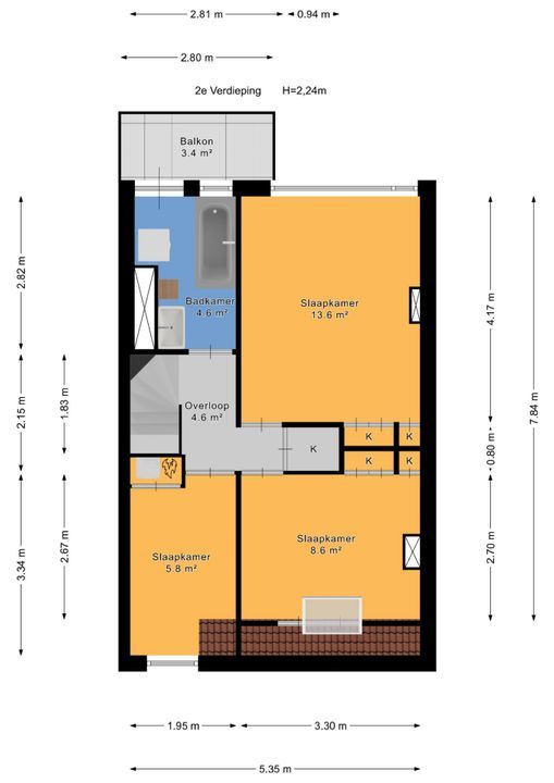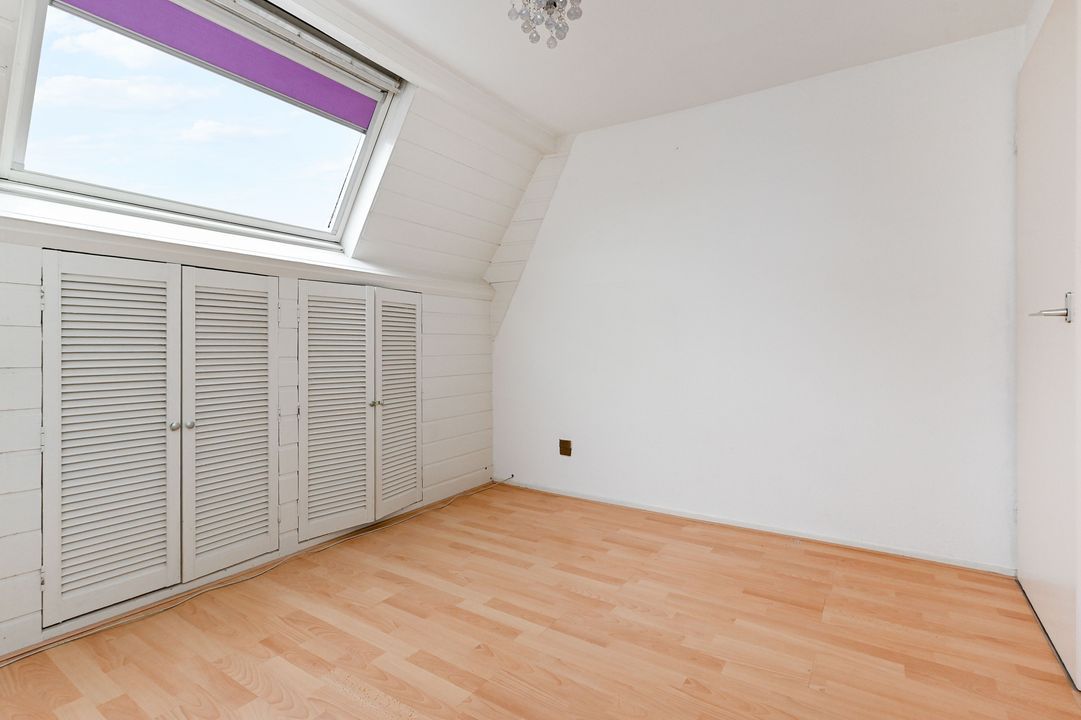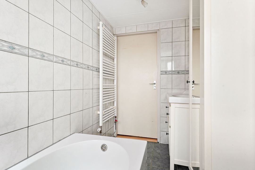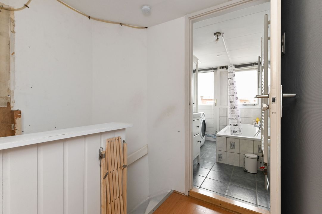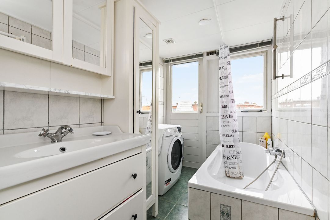 2e verdieping: overloop; voor zijkamer ca. 1,95x3,35m voorzien van dakkapel en vaste kast met opstelling cv-combiketel (Intergas Extreme 2024); voor kamer ca. 2,70x3,30m voorzien van vaste kast en Velux dakraam achter slaapkamer ca. 3,30x4,10 met vaste kast; geheel betegelde badkamer ca. 1,45x2,80m voorzien van ligbad, wastafelmeubel, opstelling wasmachine en toegang tot achterbalkon ca. 1,20x2,80m op het oosten.