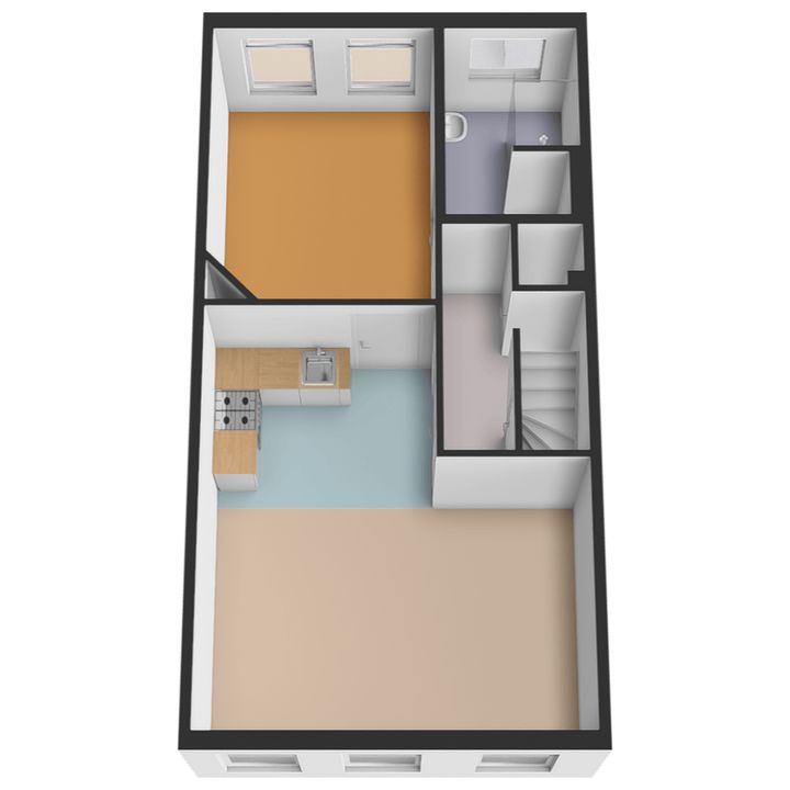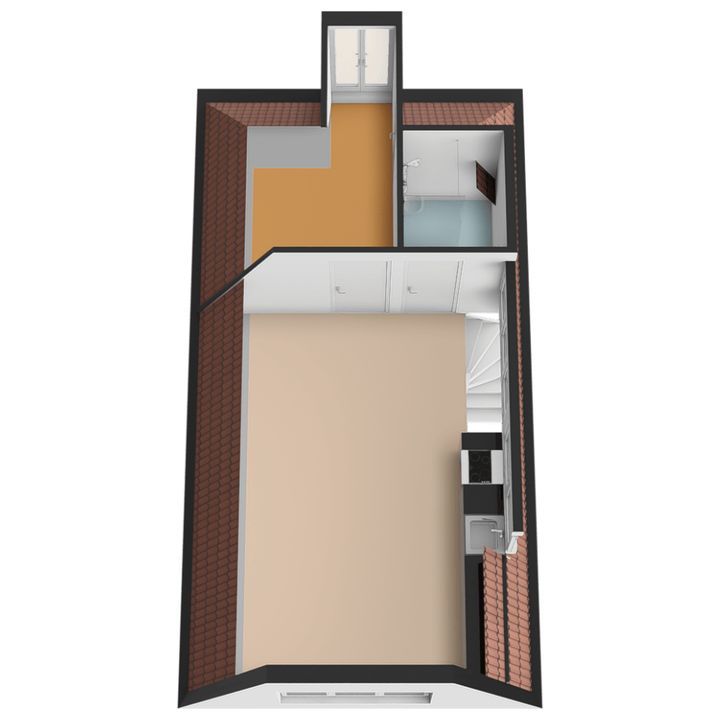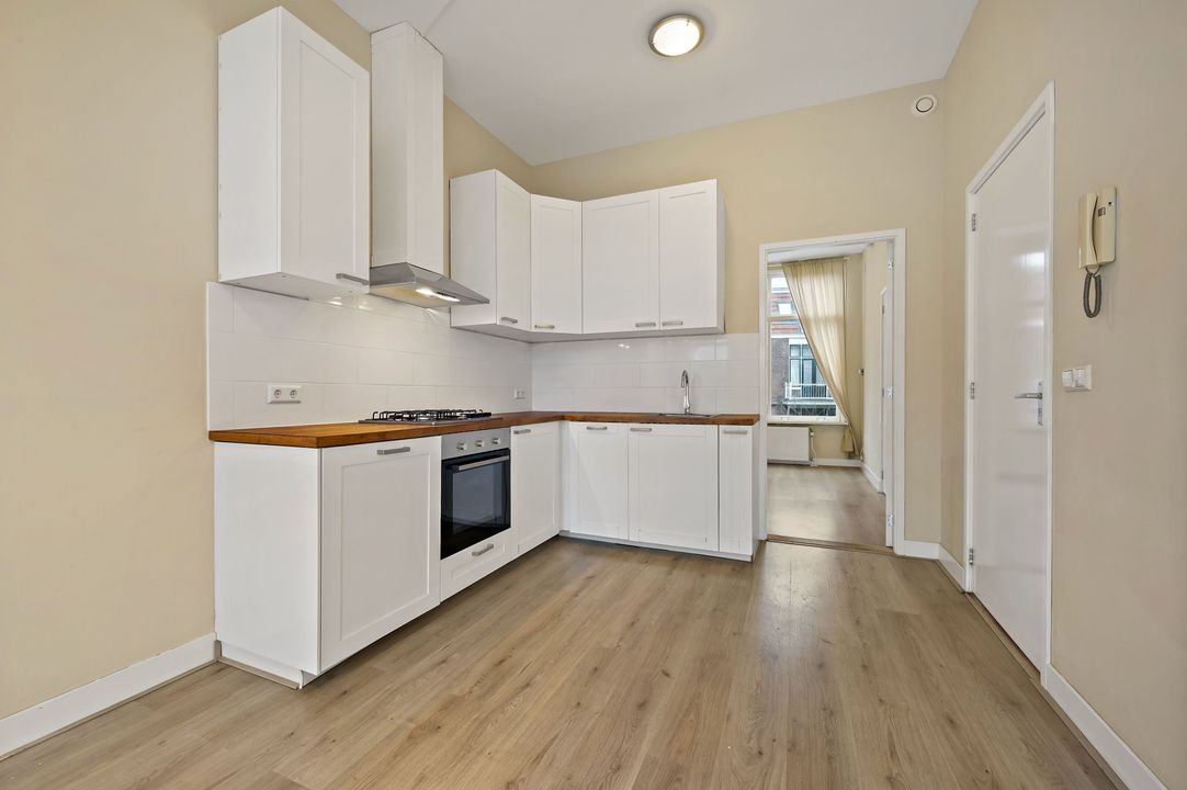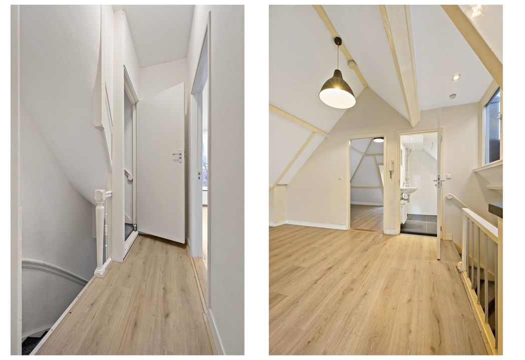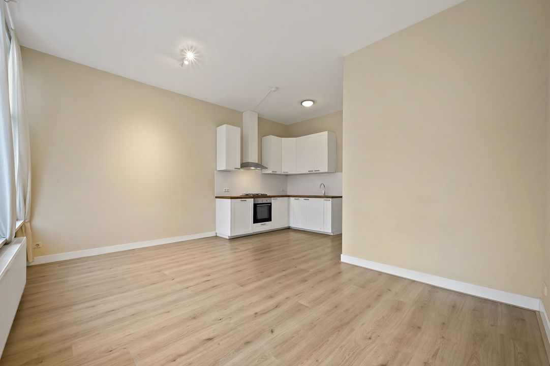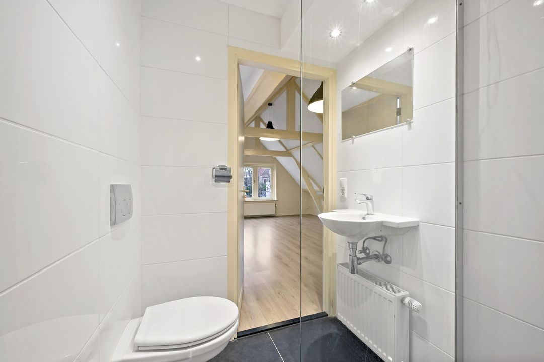 trapopgang naar de 2e (kap)verdieping: woonkamer aan de voorzijde ca. met open keuken voorzien van inductiekookplaat, oven, vaatwasmachine en koelkast; betegelde badruimte ca. 1,45x1,80m voorzien van inloopdouche, vaste wastafel, vrijdragend closet en mechanische ventilatie; achter slaapkamer ca. 2,15x2,45m met bergruimte
