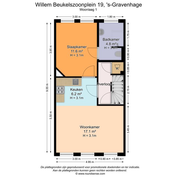 entree op straatniveau; hal met meterkast (elektra 12 groepen + 3x ALS) en trapopgang naar de 1e verdieping; overloop met geheel betegelde wasruimte; L-vormige woonkamer met open keuken ca. 3,45x4,95m en 2,10x3,00m voorzien van laminaatvloer en hoek opgestelde keukeninstallatie met gaskookplaat, oven, afzuigkap, vaatwasmachine en koelkast; doorgang naar slaapkamer ca. 3,05x3,95m met toegang tot betegelde badkamer ca. 1,85x2,75m voorzien van inloopdouche, vaste wastafel, vrijdragend closet, handdoekradiator, opstelling cv-combiketel (Remeha Tzerra 2016) en mechanische ventilatie.