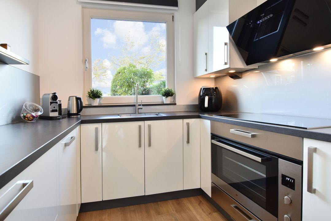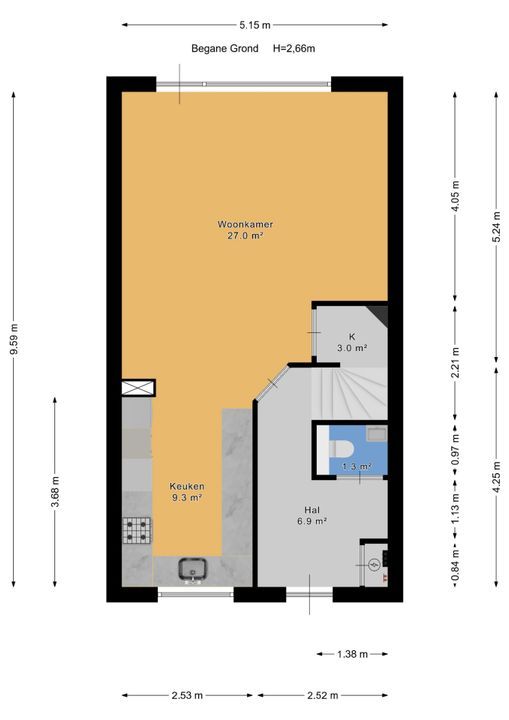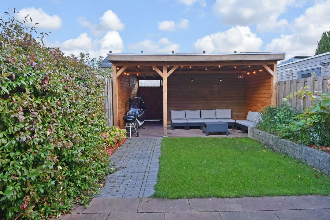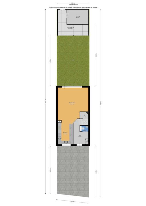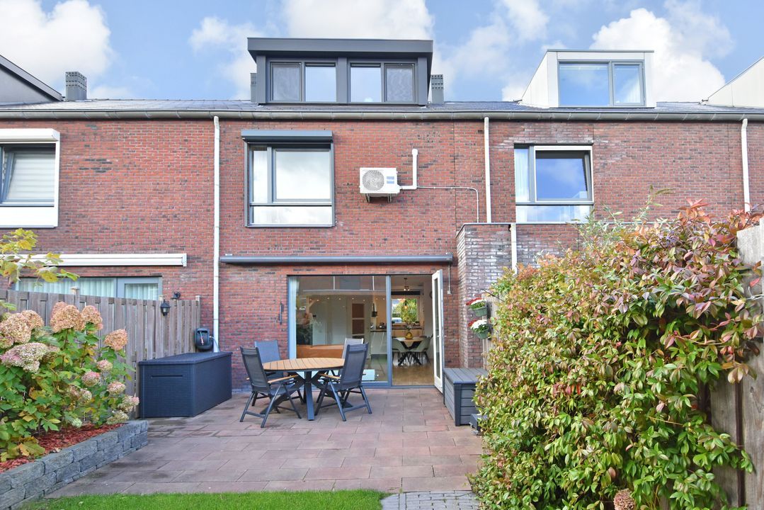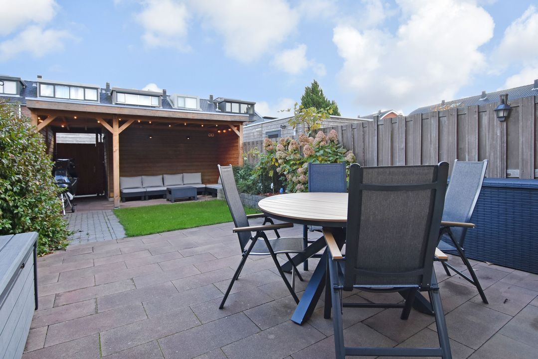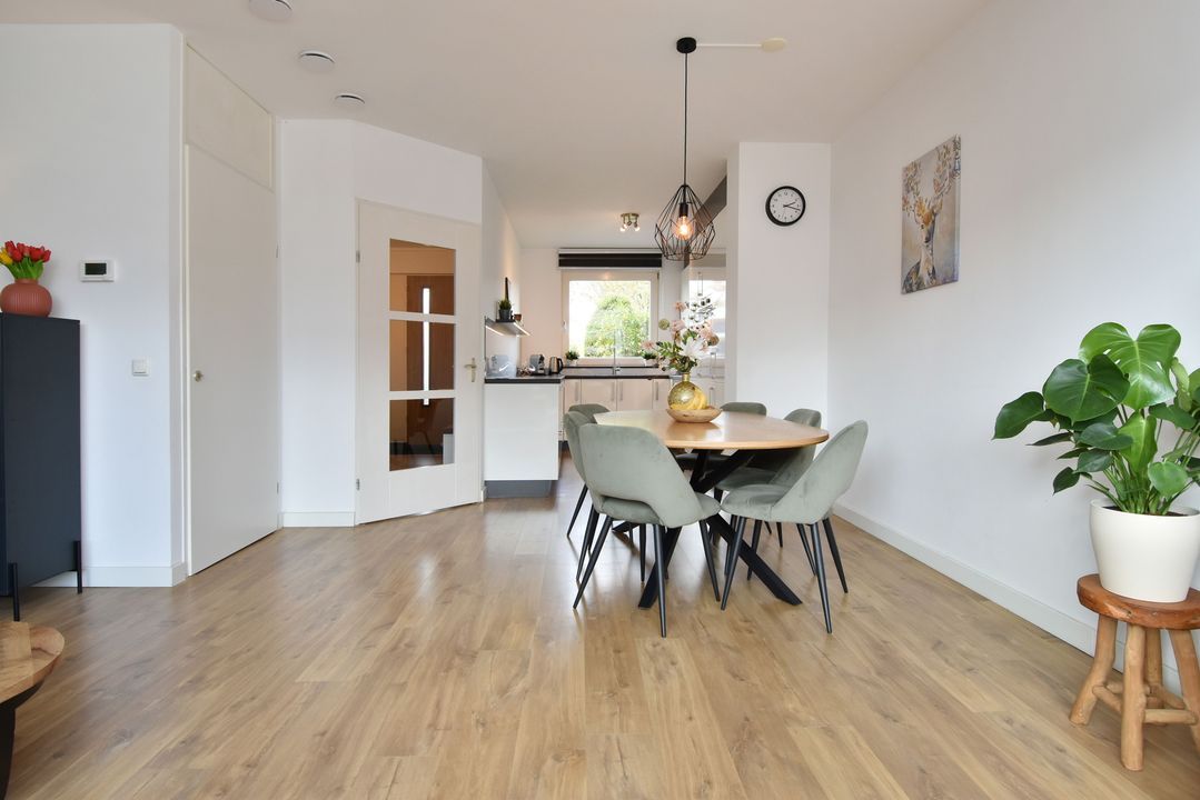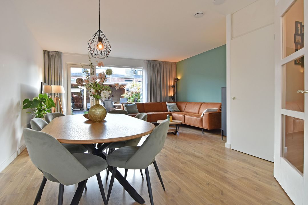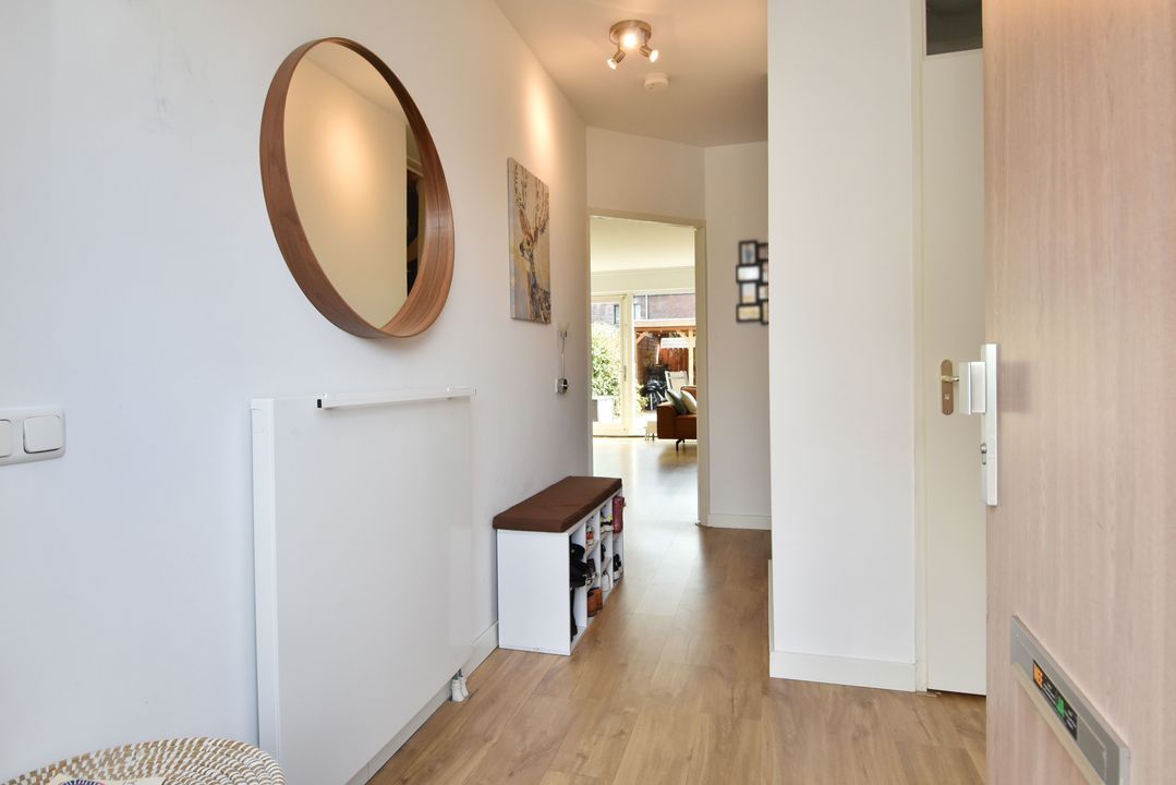 toegang via ca. 8 meter diepe voortuin met parkeerplaats; entree woonhuis; ruime hal met meterkast (elektra 8 groepen met 2x ALS) en betegeld toilet voorzien van vrijdragend closet en hoekfontein; tuingerichte woonkamer ca. 5,15x5,25m voorzien van laminaatvloer en toegang naar de achtertuin; moderne U-vormige keukeninstallatie voorzien van brede inductiekookplaat, brede oven, afzuigkap, hoge koelkast, vriezer, vaatwasmachine, combimagnetron en 2x carrouselkast; achtertuin op het zuidoosten ca. 5,50x12,85m voorzien van elektrisch zonnescherm (2022), houten berging ca. 2,45x3,60m met overdekte veranda en achteruitgang.