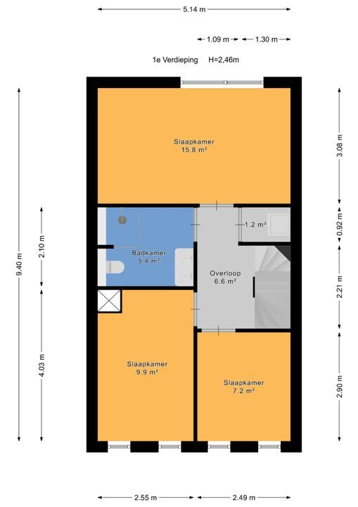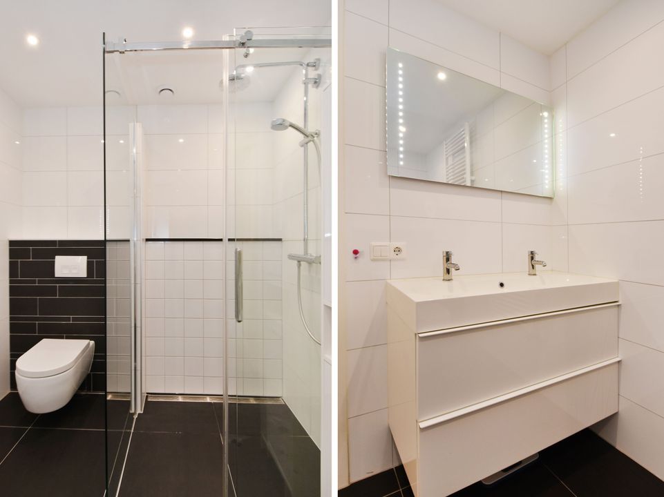 trapopgang naar de 1e verdieping: overloop voorzien van vaste kast met opstelling wasmachine en droger; voor slaapkamer ca. 2,55x4,05m; voor zijkamer ca. 2,50x2,90m; achter slaapkamer over de gehele breedte ca. 3,10x5,15m voorzien van een aircounit; geheel betegelde badkamer ca. 2,10x2,55m voorzien van een ruime douche, dubbele wastafelmeubel voorzien van spiegel met verwarming, vrijdragend closet en handdoekradiator.