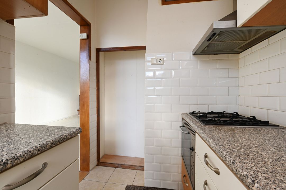 toegang via afgesloten portiek (voor 2 appartementen) naar de 1e verdieping; entree appartement; L-vormige hal met geheel betegeld toilet; vaste kast onder trapopgang met opstelling elektra (4 groepen met ALS); voor slaapkamer ca, 2,55x3,10m; doorgebroken woon-/eetkamer ca. 3,40 deels 3,10x9,60m voorzien van gemetselde schouw met gasblok openhaard en doorgang naar keuken ca. 1,85x3,35m voorzien van net keukenblok met gaskookplaat, afzuigkap, oven, vaatwasmachine, koel-/vriescombinatie en deur naar achterbalkon ca. 1,00x3,05m op het zuidoosten; achter zijkamer is opgedeeld in een betegelde badruimte ca. 1,30x2,10m voorzien van een douchegedeelte en wastafelmeubel en doorgang naar kamer van ca. 2,10x2,65m.