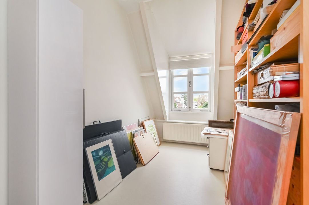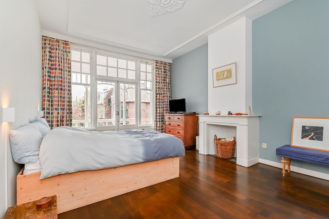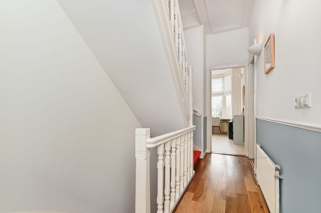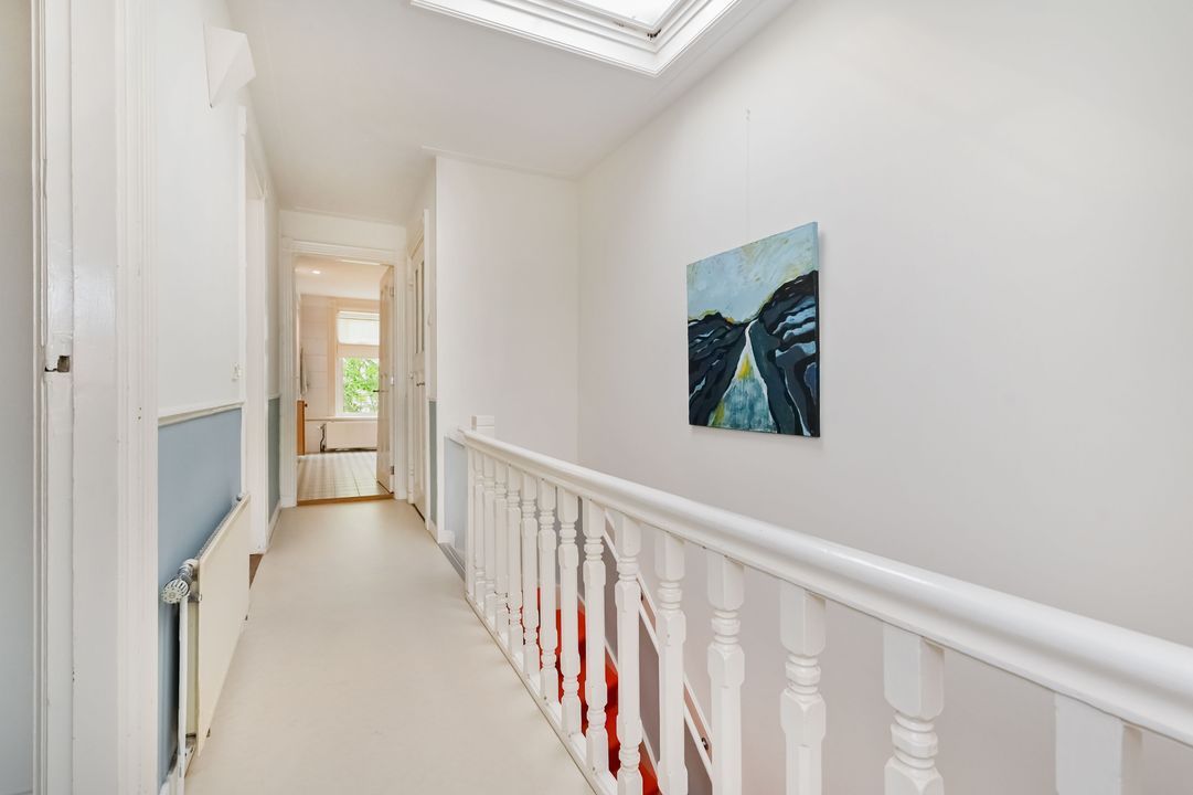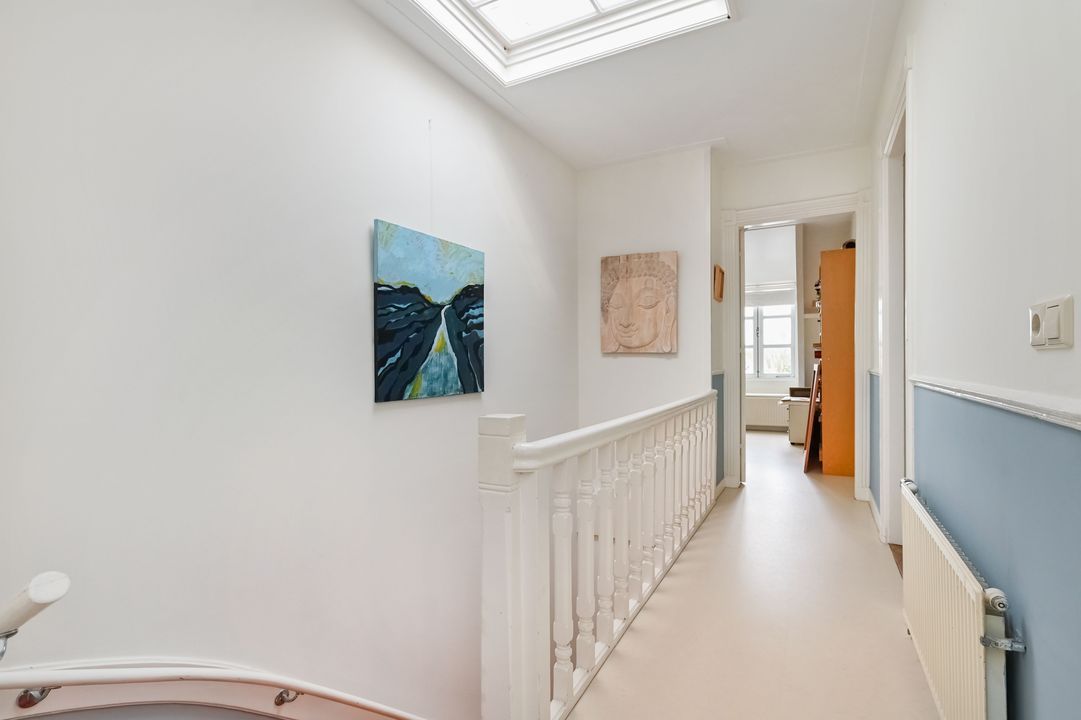 trapopgang naar de 1e verdieping: overloop voorzien van houten strokenvloer; betegeld toilet voorzien van vrijdragend closet en fontein; voor- en achterkamer ensuite voorzien van schuifseparatie, 4 vaste kasten en houten strokenvloer; voorkamer ca. 3,95x5,95m voorzien van schouw en openslaande deuren naar voorbalkon/veranda ca. 1,35x3,65m met fraai uitzicht door de Helmstraat; achterkamer ca. 3,95 deels 3,45x7,65m aan weerszijden voorzien van gedeeltelijk open (boeken)kastenwand; moderne en betegelde badkamer ca. 2,00 deels 2,45x4,00m voorzien van ligbad, separate douche, wastafelmeubel, handdoekradiator en vaste kast; voorzijkamer/werkkamer ca. 2,00x4,35m voorzien van erkerkozijn met fraai uitzicht door de Helmstraat.