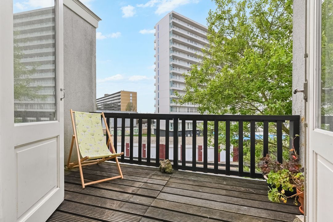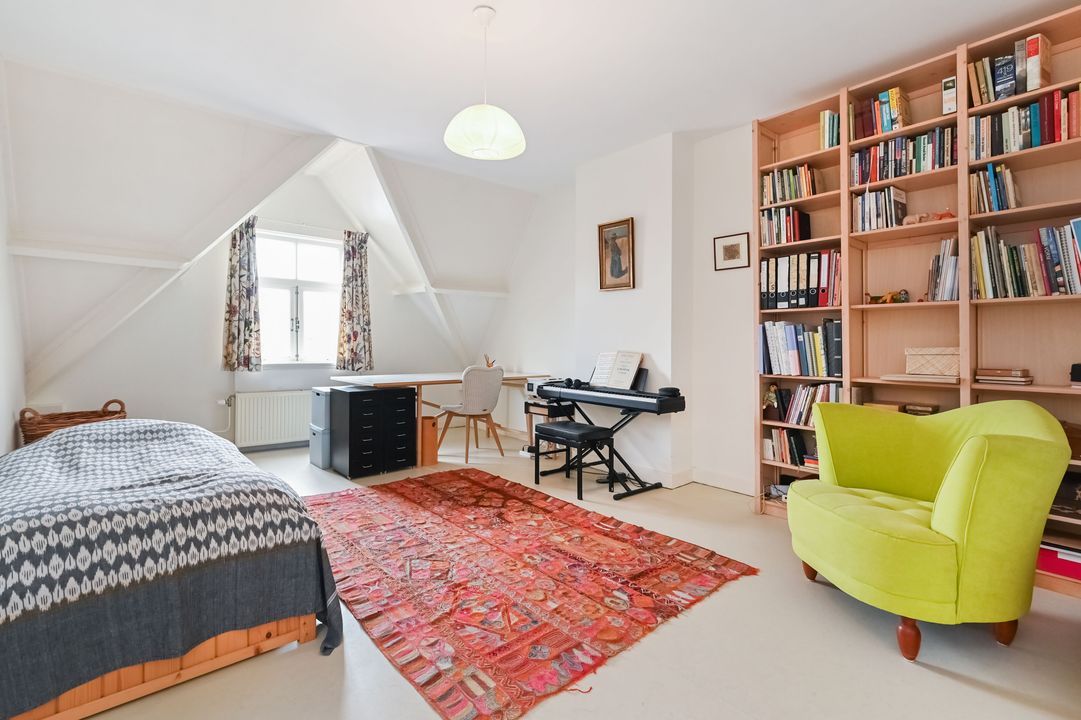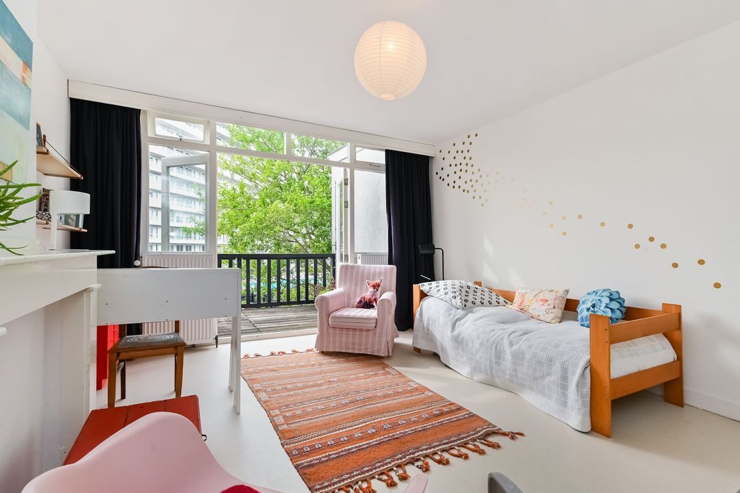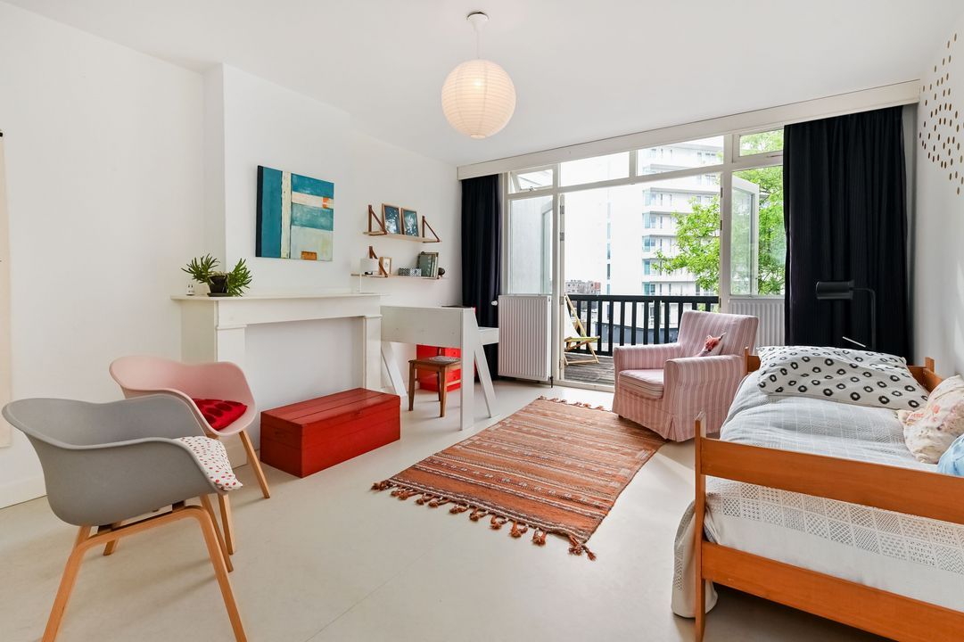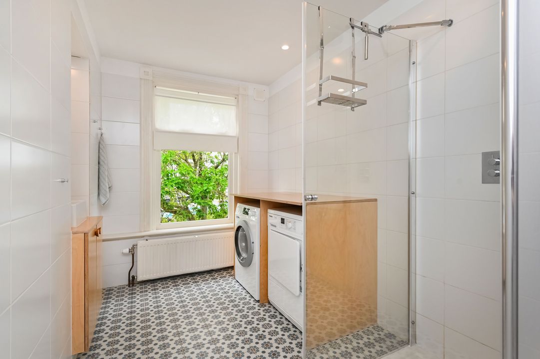 trapopgang naar de 1e verdieping: overloop voorzien van houten strokenvloer; betegeld toilet voorzien van vrijdragend closet en fontein; voor- en achterkamer ensuite voorzien van schuifseparatie, 4 vaste kasten en houten strokenvloer; voorkamer ca. 3,95x5,95m voorzien van schouw en openslaande deuren naar voorbalkon/veranda ca. 1,35x3,65m met fraai uitzicht door de Helmstraat; achterkamer ca. 3,95 deels 3,45x7,65m aan weerszijden voorzien van gedeeltelijk open (boeken)kastenwand; moderne en betegelde badkamer ca. 2,00 deels 2,45x4,00m voorzien van ligbad, separate douche, wastafelmeubel, handdoekradiator en vaste kast; voorzijkamer/werkkamer ca. 2,00x4,35m voorzien van erkerkozijn met fraai uitzicht door de Helmstraat.