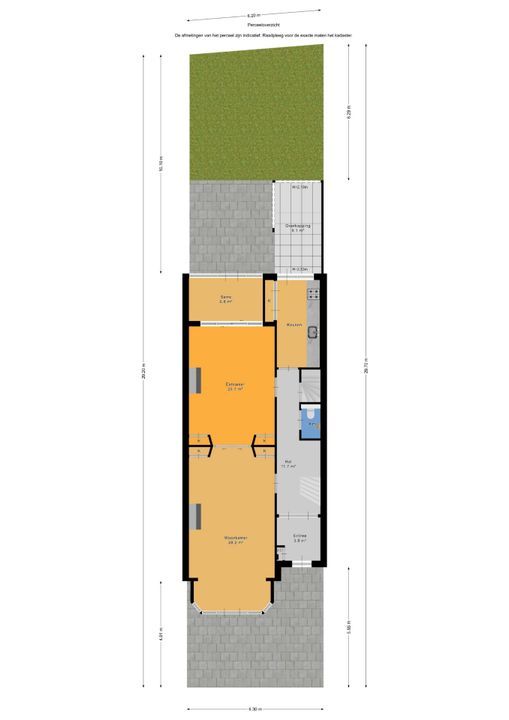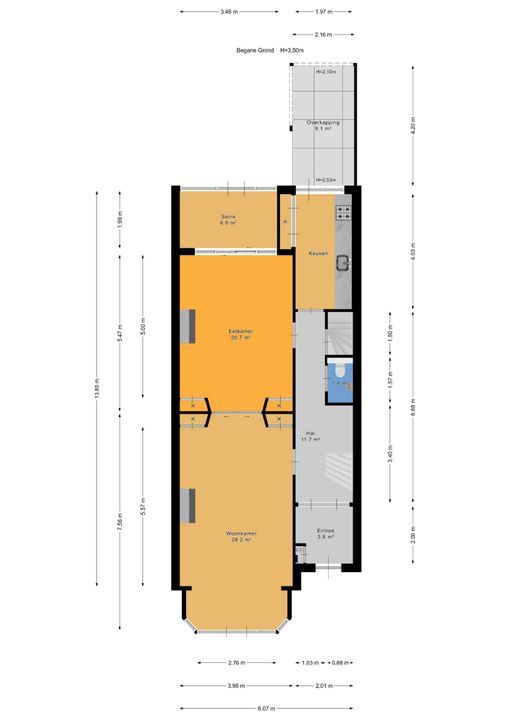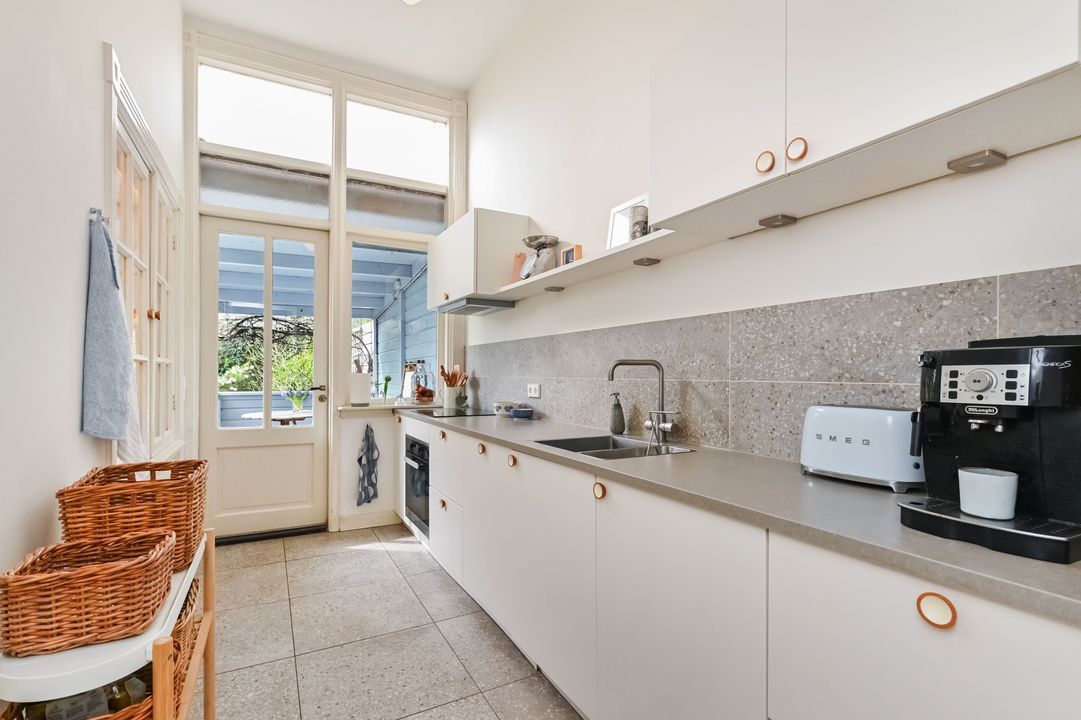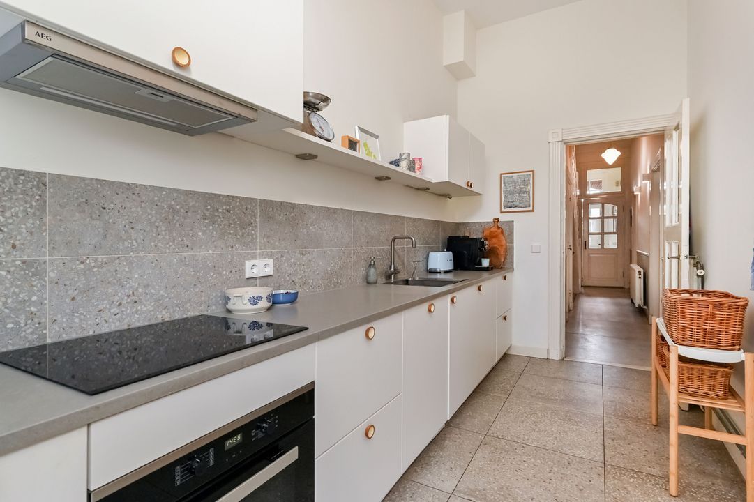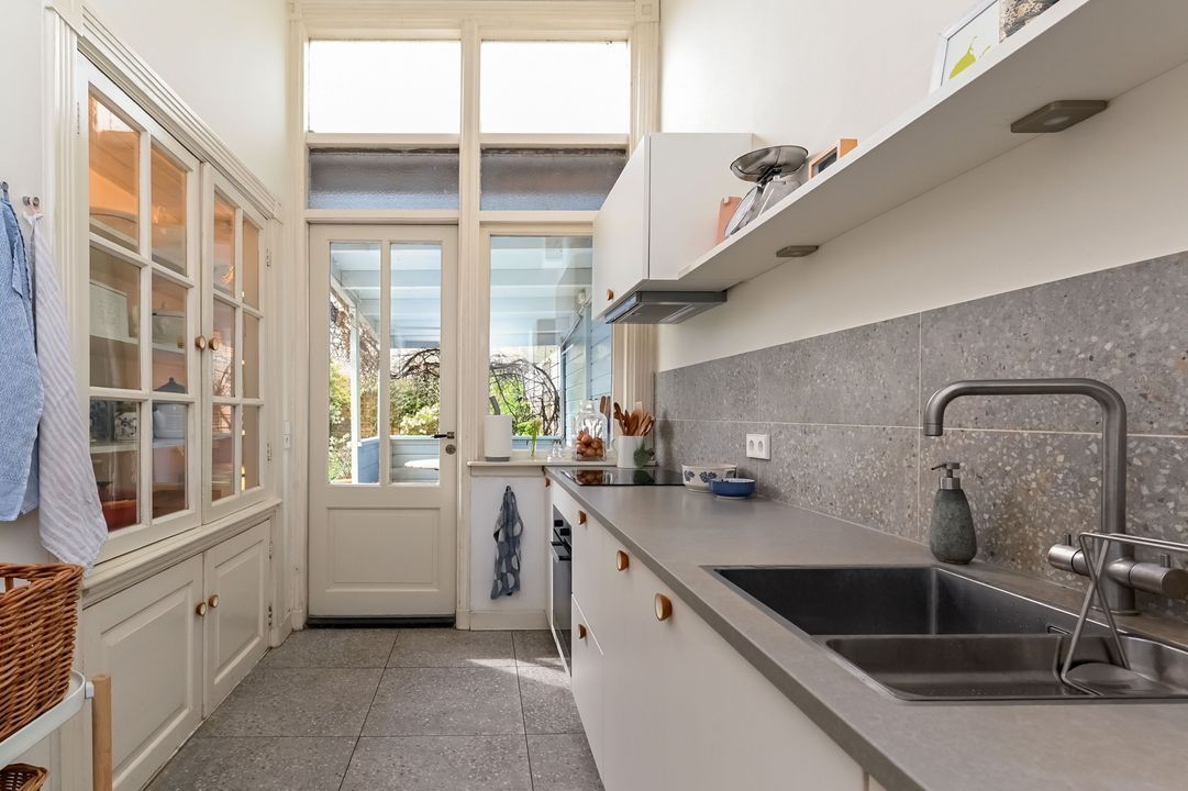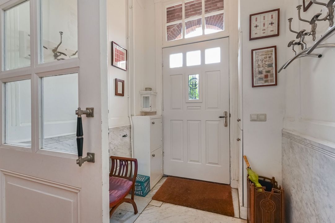 toegang via voortuin; entree woonhuis; vestibule ca. 2,00x2,00m voorzien van marmerenvloer, meterkast (16 groepen + 4x ALS) en 2 tochtdeuren naar hal met trapopgang, marmeren vloer en betegeld toilet voorzien van vrijdragend closet, authentiek fontein en mechanische ventilatie; voor- en achterkamer ensuite voorzien van schuifseparatie en 4 vaste kasten, 2 schouwen waarvan 1 met gasblok open haard en een fraaie visgraatparketvloer met bies; voorkamer ca. 3,95x7,55m voorzien van fraaie erker met glas-in-lood bovenlichten en openslaande deuren naar de voortuin; achterkamer ca. 3,95x5,45m met schuifdeuren naar serre ca. 2,00x3,45m voorzien van openslaande deuren naar achtertuin; keuken ca. 1,95x4,05m voorzien van een moderne keukeninstallatie met inductiekookplaat, combioven, recirculatiekap, vaatwasmachine, koelkast en royale inbouwservieskast; toegang tot achtertuin op het westen ca. 6,35x10,30m voorzien van overkapping; trap naar kelderruimte ca. 1,85x5,55m en 1,75x3,55m met een stahoogte van ca. 1,90/2,00m.