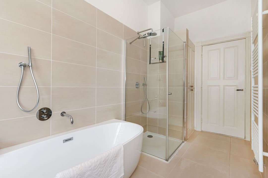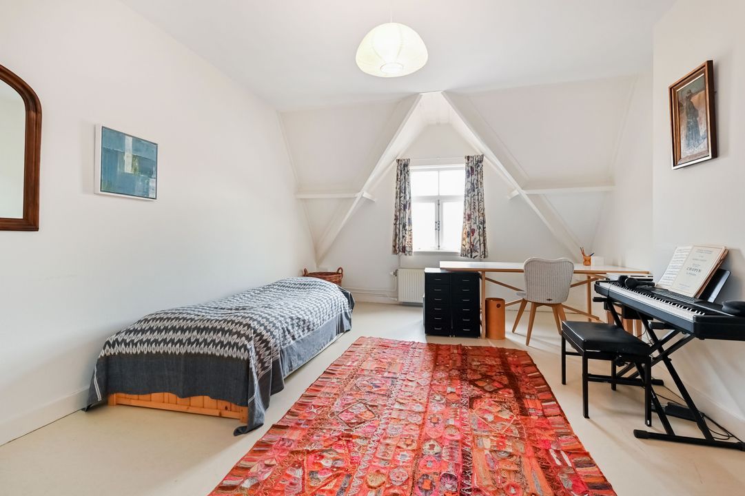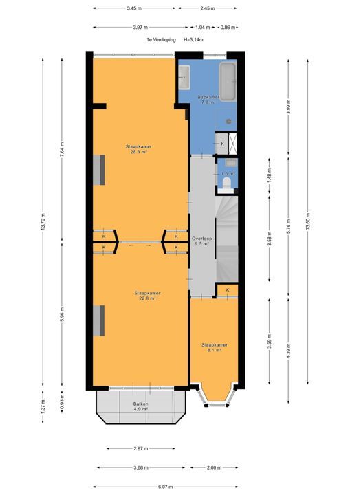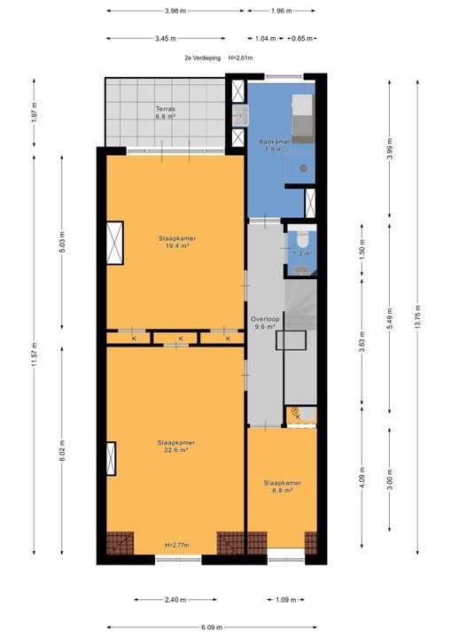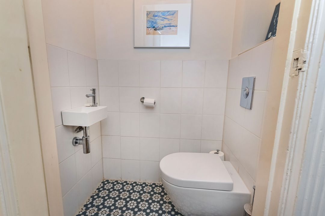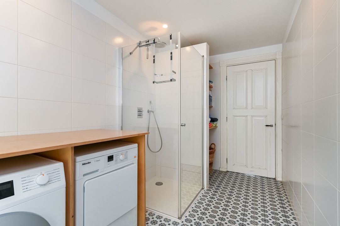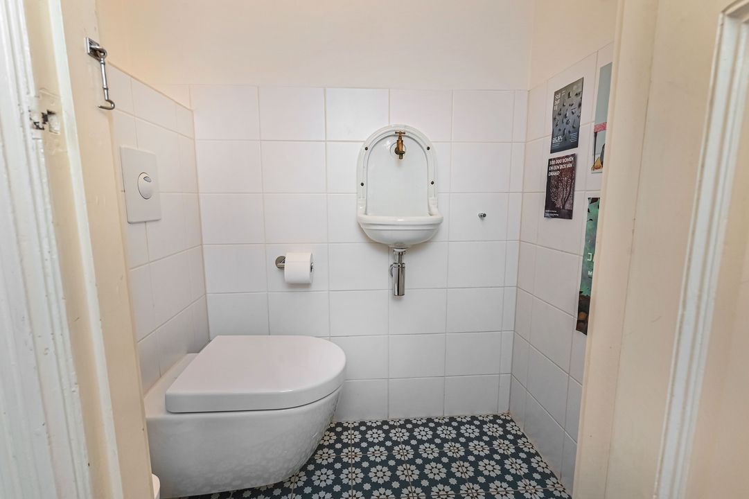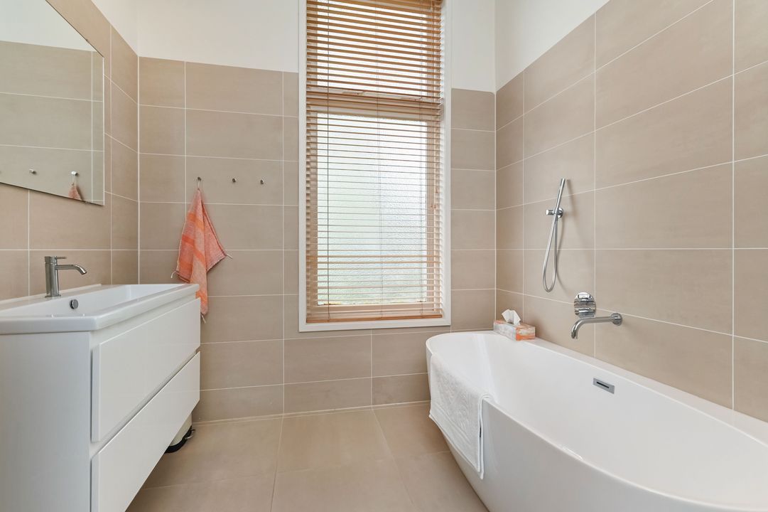 trapopgang naar 2e verdieping: overloop met daklicht en betegeld toilet met fontein; voor slaapkamer ca. 3,95x6,00m met vaste kast; achter slaapkamer ca. 3,95x5,00m met 2 vaste kasten en openslaande deuren naar achterbalkon/terras op het westen ca. 1,95x3,45m; voorzijkamer ca. 2,00x3,50m voorzien van vaste kast met opstelling van cv-combiketel (Remeha Calenta 2018) en omvormer zonnepanelen; geheel betegelde badkamer ca. 2,00x4,00m voorzien van douche, wastafelmeubel, opstelling wasmachine en droger en vaste kast.