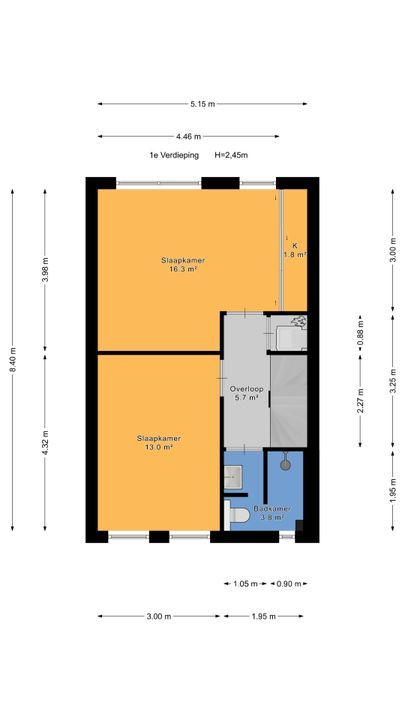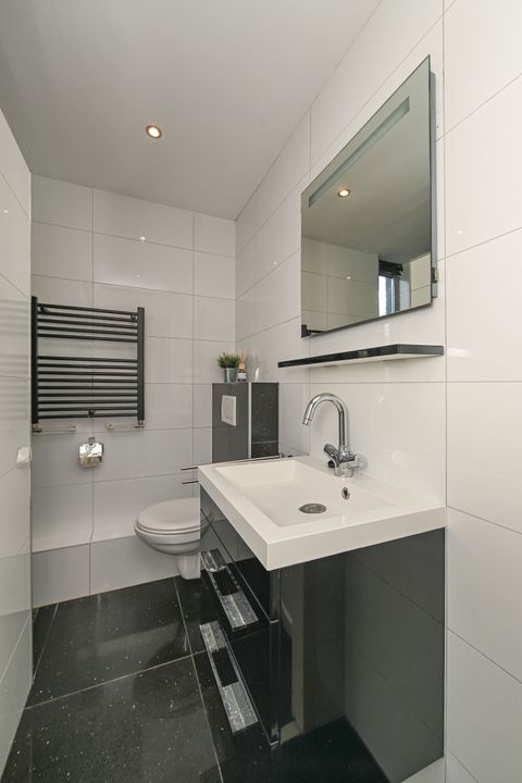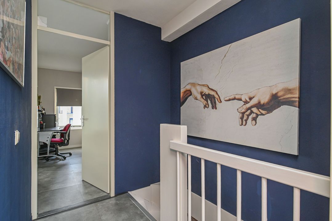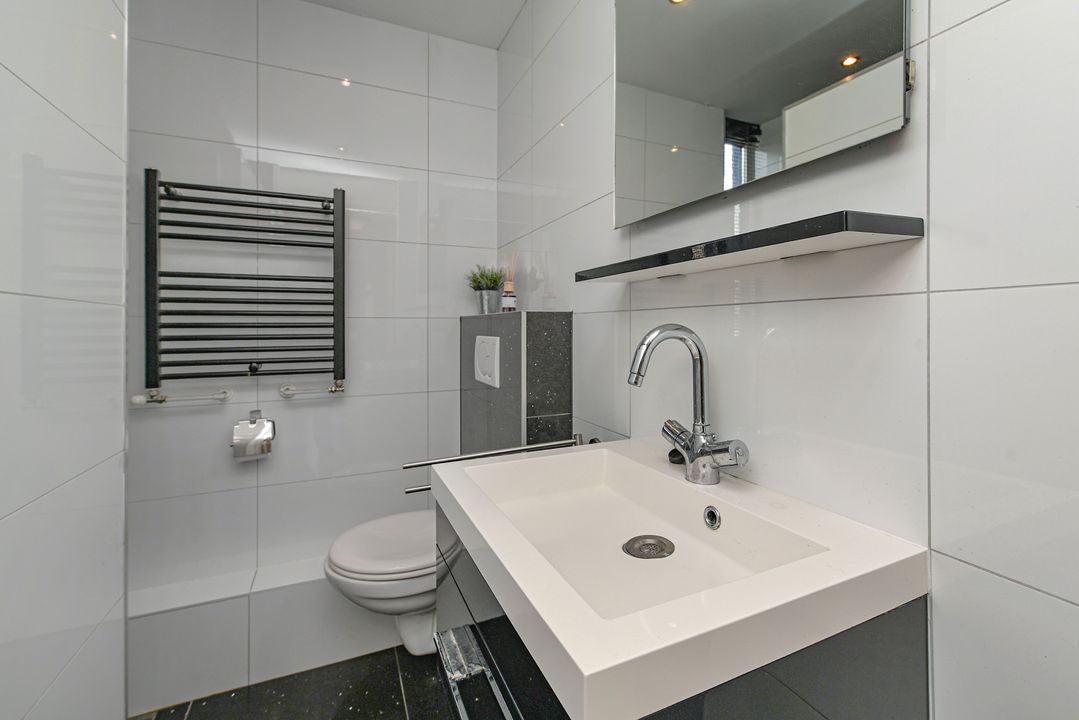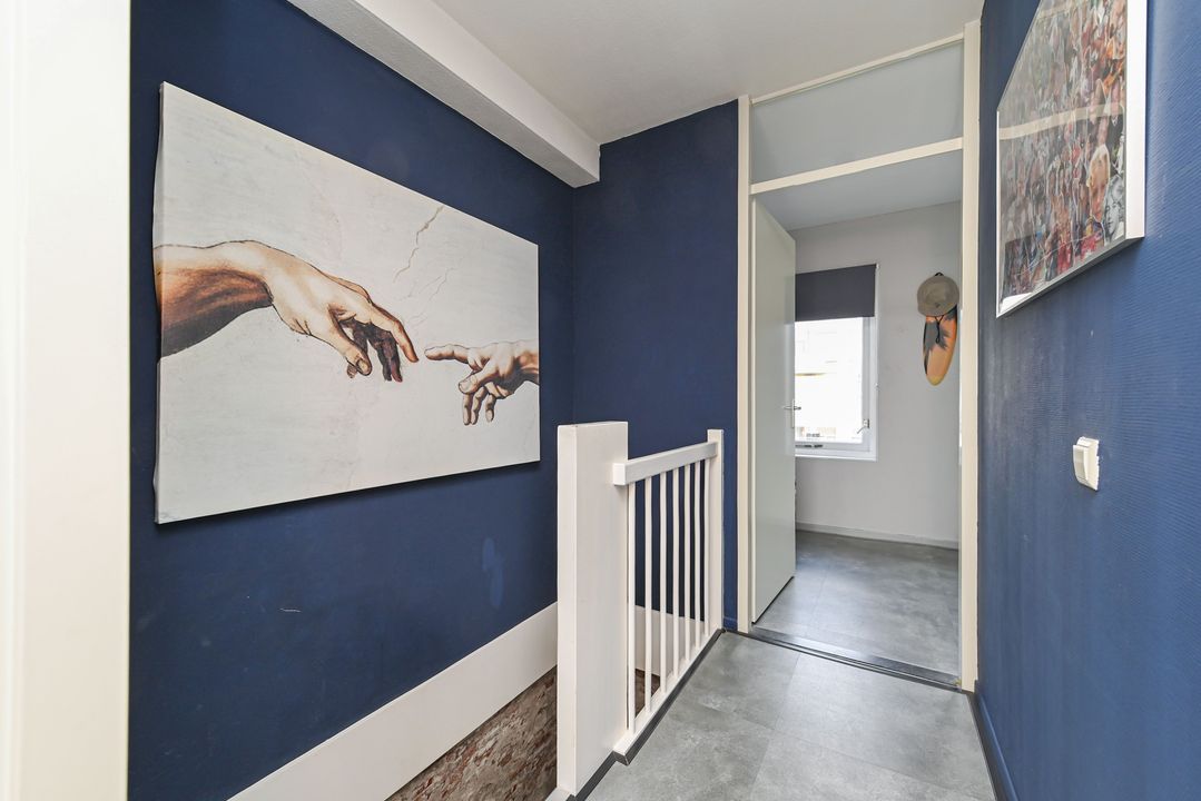 trapopgang naar de 1e verdieping; overloop, vaste kast met opstelling cv-combiketel Remeha Tzerra 2015 en mechanische ventilatie; voor slaapkamer ca. 3,00x4,30m; L-vormige achter slaapkamer ca. 3,00x5,15m en 1,00x3,00m; geheel betegelde badkamer ca. 1,95x2,00m voorzien van ruime inloopdouche, wastafelmeubel, vrijdragend closet, handdoekradiator en mechanische ventilatie.