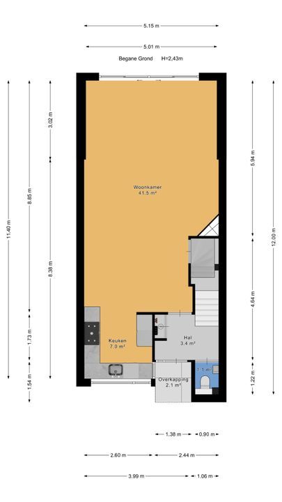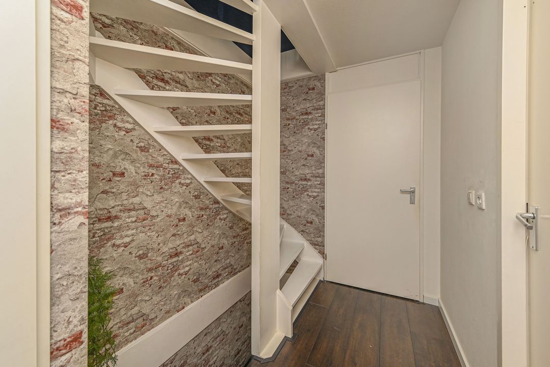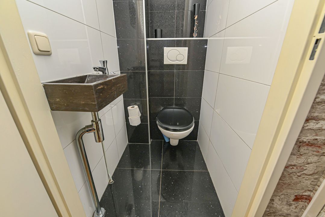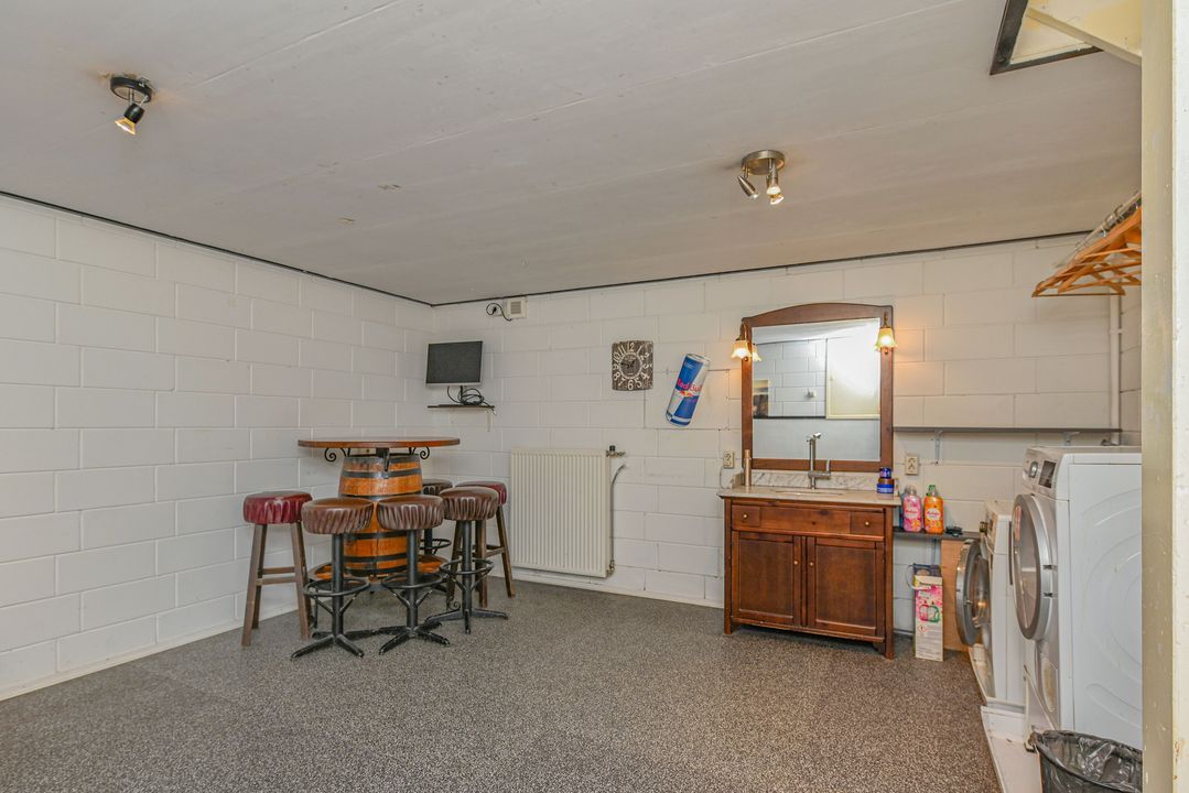 entree op straatniveau; hal, meterkast (elektra 8 groepen + 2x ALS), geheel betegeld toilet voorzien van vrijdragend closet en fontein; uitgebouwde en tuingerichte woonkamer ca. 5,15x9,00m voorzien van Eiken strokenvloer, convectorput en schuifpui naar achtertuin; via voormalige vaste kast toegang tot kelderruimte ca. 4,55x4,70 met een stahoogte van ca. 2,25m, wastafelmeubel, opstelling wasmachine/droger en toegang tot bergruimte/kruipruimte aan de voorzijde; open keuken aan de voorzijde ca. 2,60x2,65m voorzien van hoekkeuken met Smeg 5-pits RVS gasfornuis met oven, recirculatiekap, vaatwasmachine en koel-/vriescombinatie; achtertuin op het zuidwesten ca. 5,40x7,20m en 1,55x3,15m met achteruitgang en houten berging ca. 2,90x3,50m met een stahoogte van ca. 2,40m.