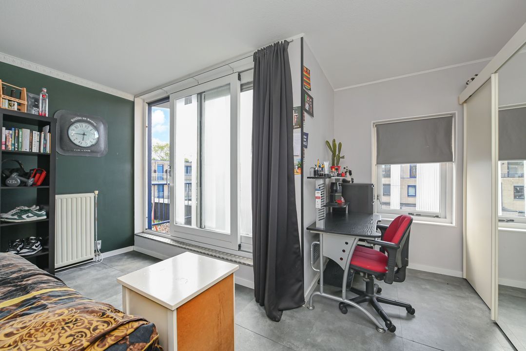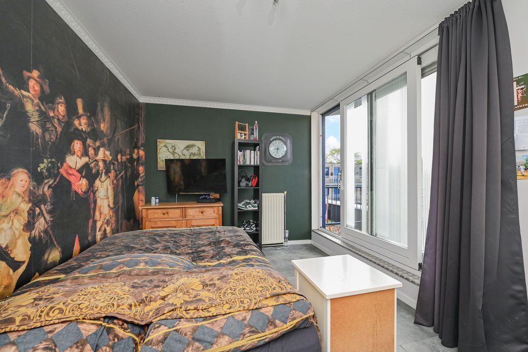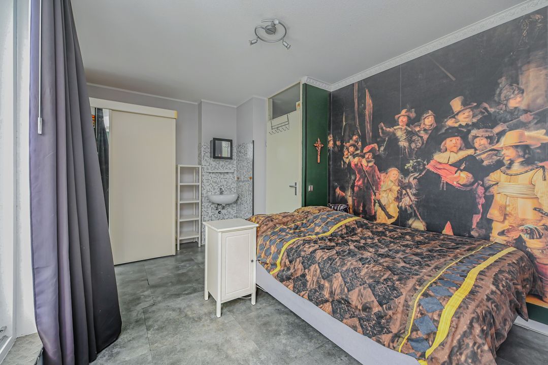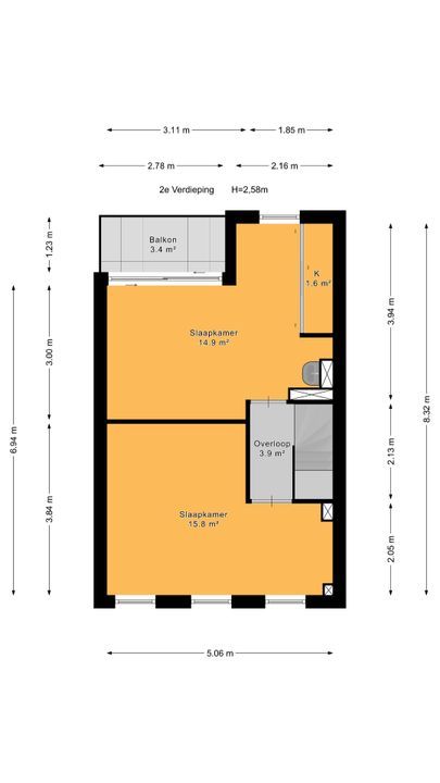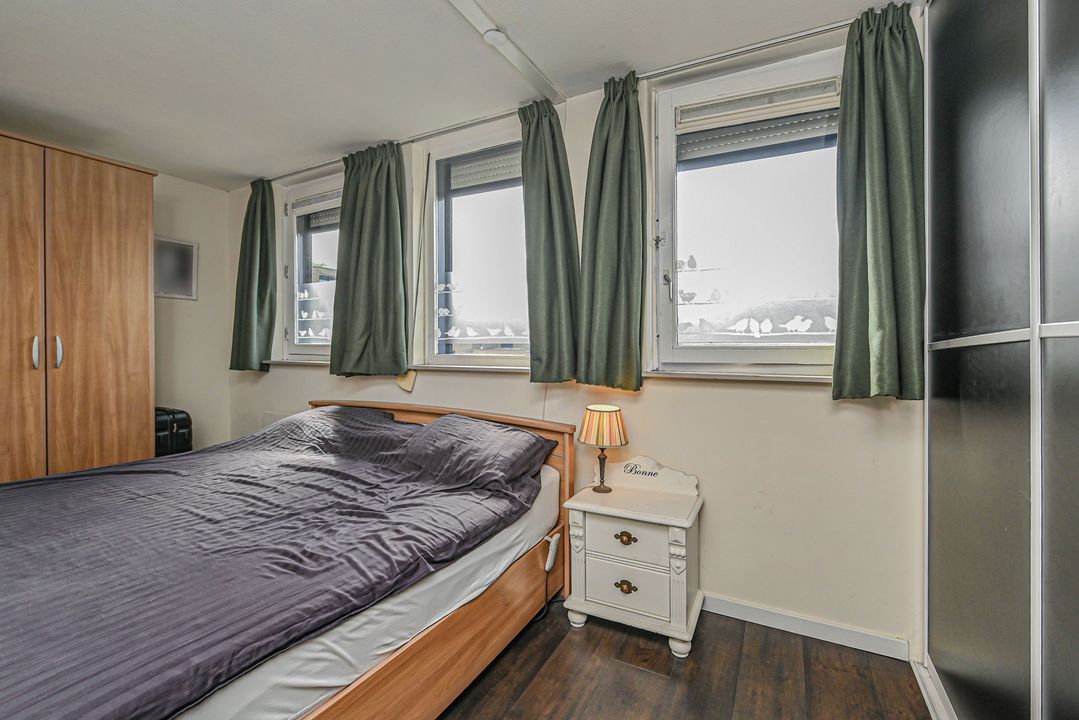 trapopgang naar de 2e verdieping: overloop; L-vormige voor slaapkamer ca. 3,15x3,85m en 2,00x2,05m; L-vormige achter slaapkamer ca. 3,00x5,10m en 1,50x2,15m met vaste wastafel en schuifpui naar achterbalkon ca. 1,25x2,80m.