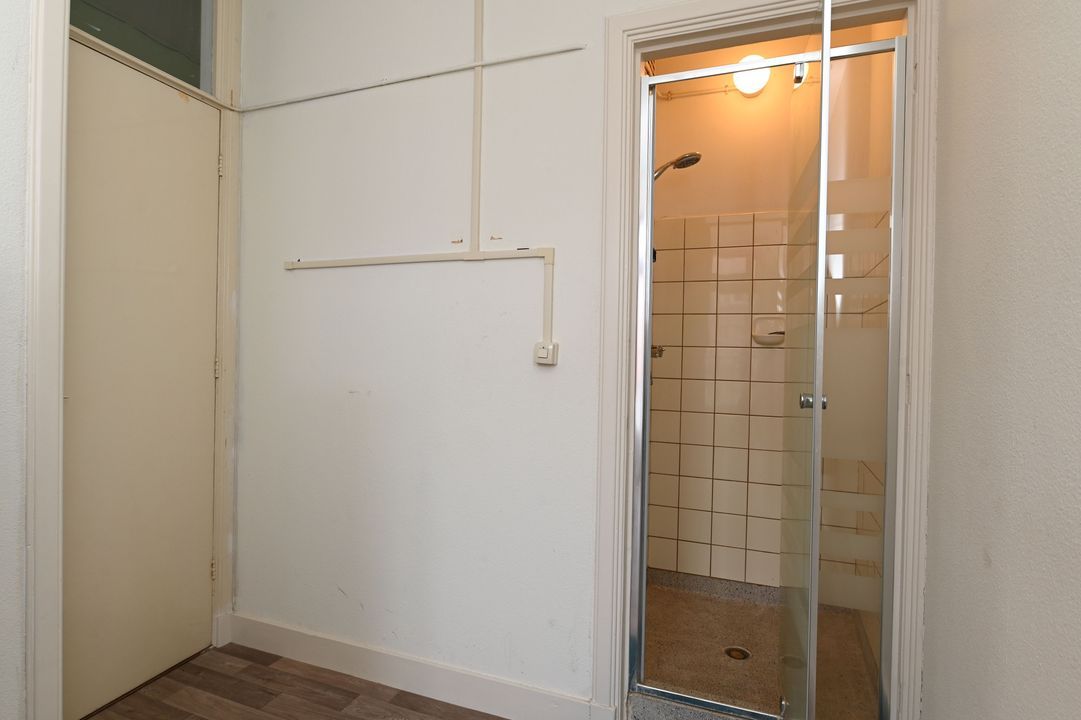 toegang via open portiek naar de 1e verdieping; entree appartement; L-vormige hal met 2 vaste kasten (opstelling elektra 2 groepen met ALS) en toegang tot betegeld toilet; voor- en achterkamer ensuite (schuifseparatie is dichtgezet) voorzien van 3 vaste kasten; voorkamer ca. 3,40x5,80m met laminaatvloer; voorzijkamer ca. 2,80x2,85m; achter slaapkamer ca. 3,20 deels 2,55x5,60m voorzien van schouw en openslaande deuren naar achterbalkon; achterzijkamer ca. 1,90x3,95m voorzien van wastafelmeubel, opstelling wasmachine en cv-combiketel (Intergas Kompakt HRE 2016), toegang tot doucheruimte ca. 0,90x1,00m en openslaande deuren naar achterbalkon; keuken ca. 1,90 deels 1,50x2,90m voorzien van eenvoudig keukenblok; achterbalkon over de gehele breedte ca. 0,95x6,50m met balkonkast.