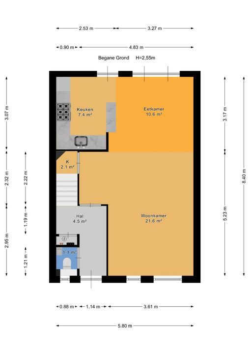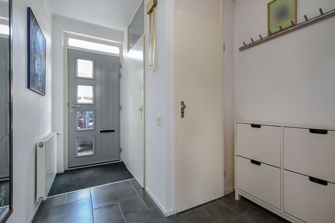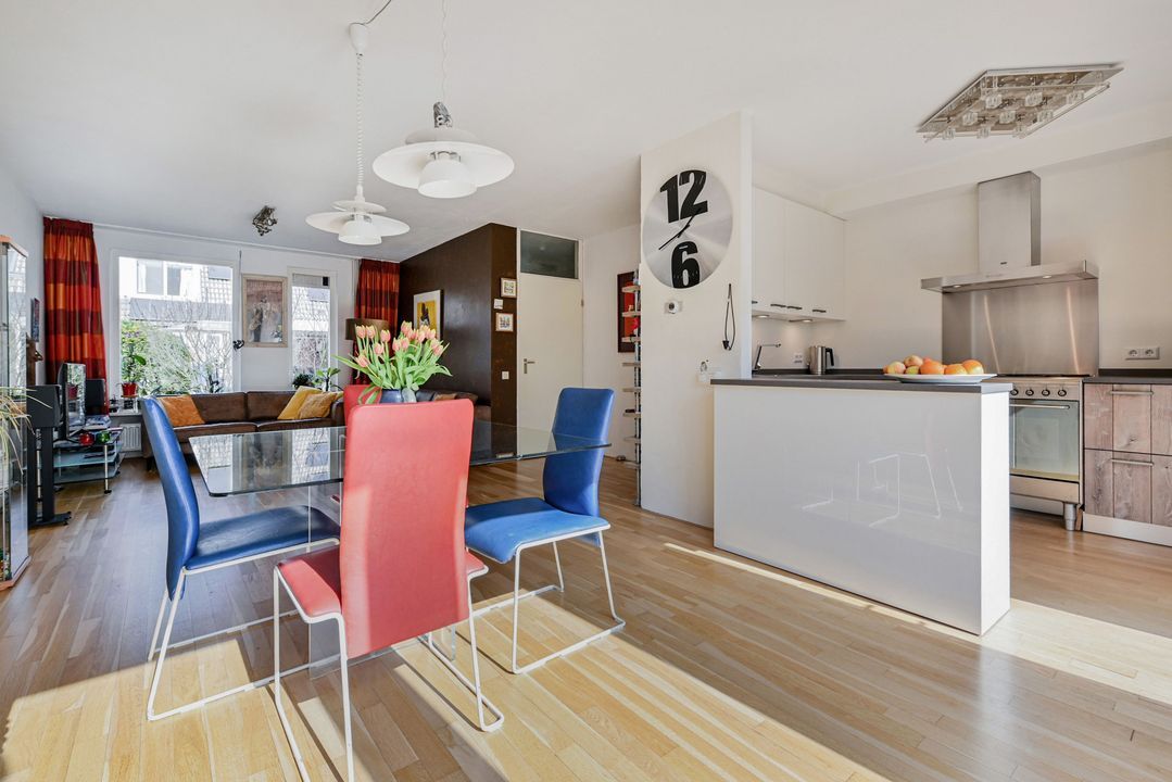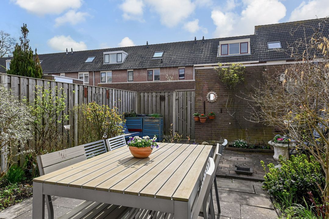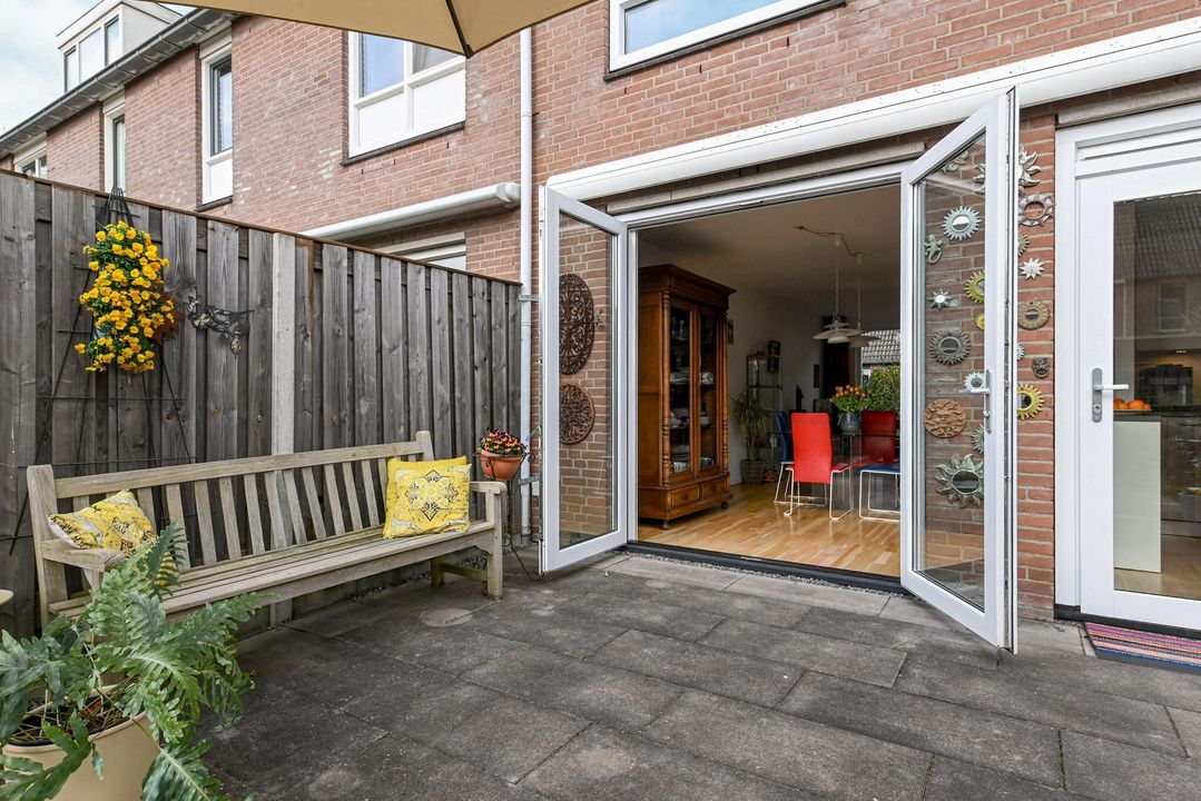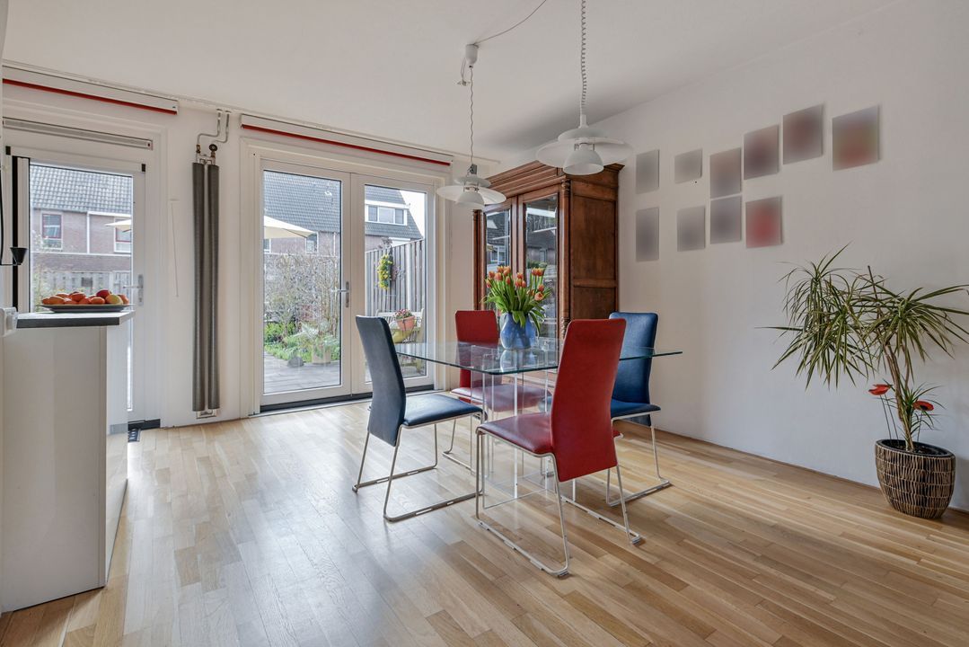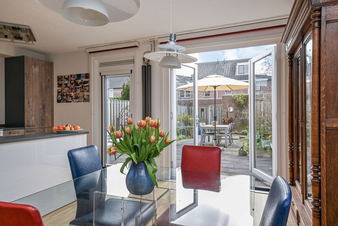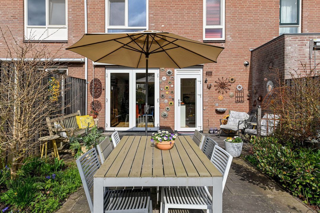 toegang via voortuin met parkeervoorziening; entree woonhuis; hal voorzien van een plavuizenvloer, meterkast (elektra 6 groepen + ALS) en geheel betegeld toilet met vrijdragend closet en fontein; lichte doorzon woonkamer ca. 3,60x8,40m en 1,25x2,25m voorzien van een Eiken parketvloer, vaste kast onder de trapopgang, design radiator en openslaande deuren naar de achtertuin; moderne U-vormige keukeninstallatie voorzien van 6-pits gasfornuis met brede oven en afzuigkap, koel-/vriescombinatie en vaatwasmachine; royale achtertuin op het zuidoosten ca. 6,00x12,00m voorzien van een zonnescherm, stenen berging ca. 1,60x3,00m en achteruitgang.