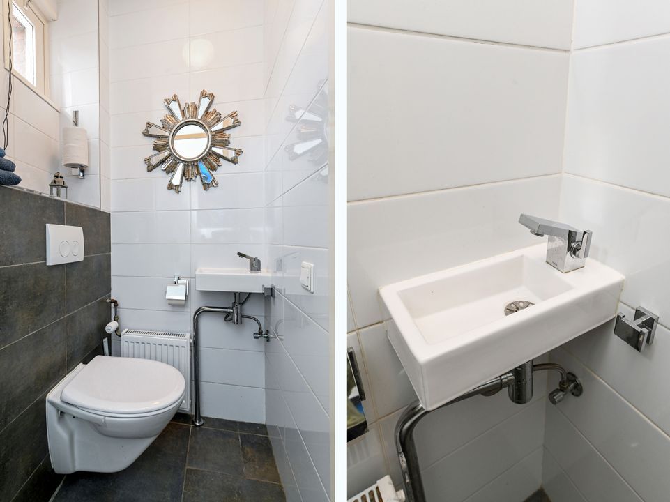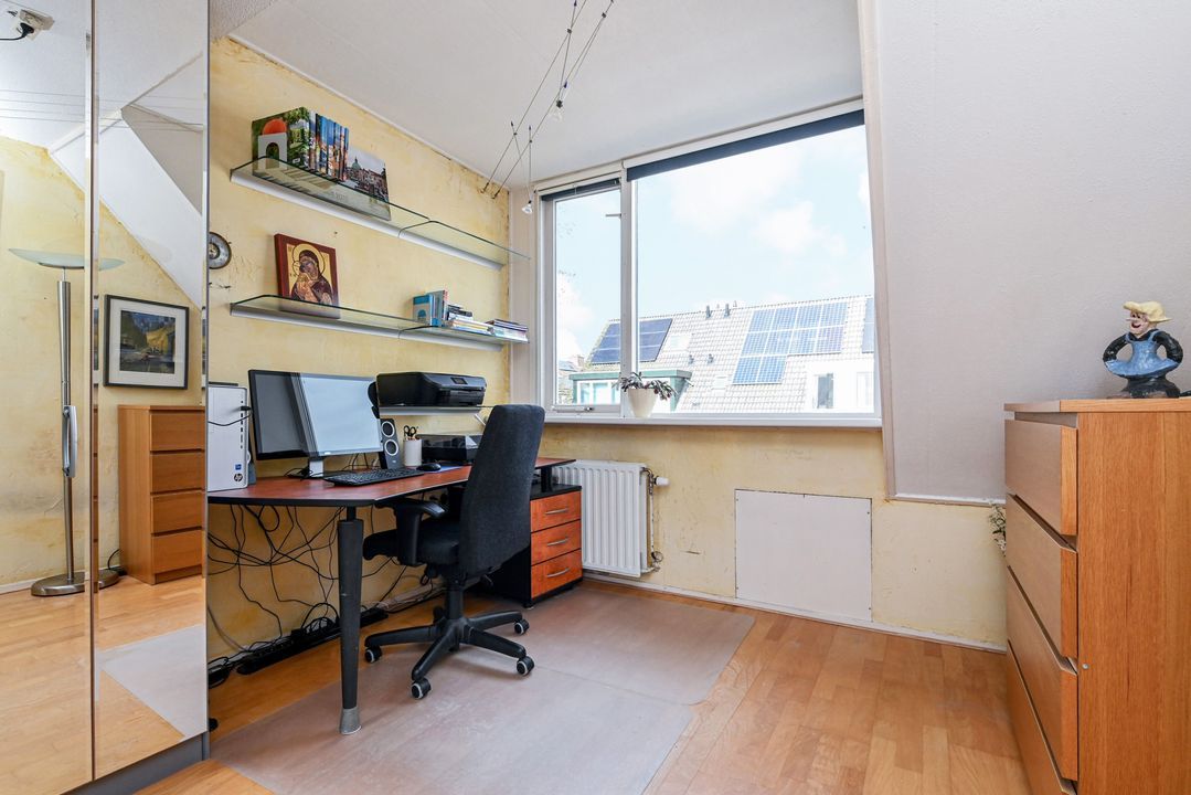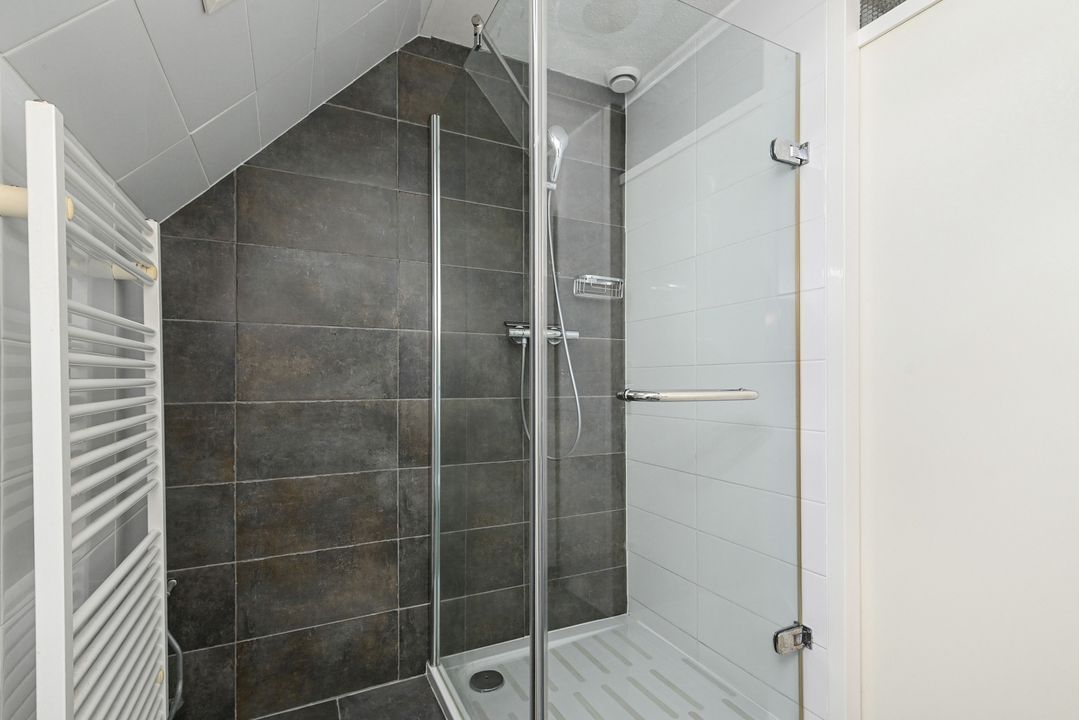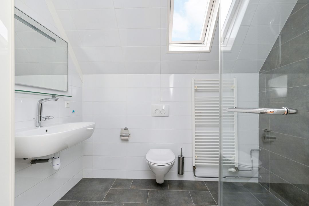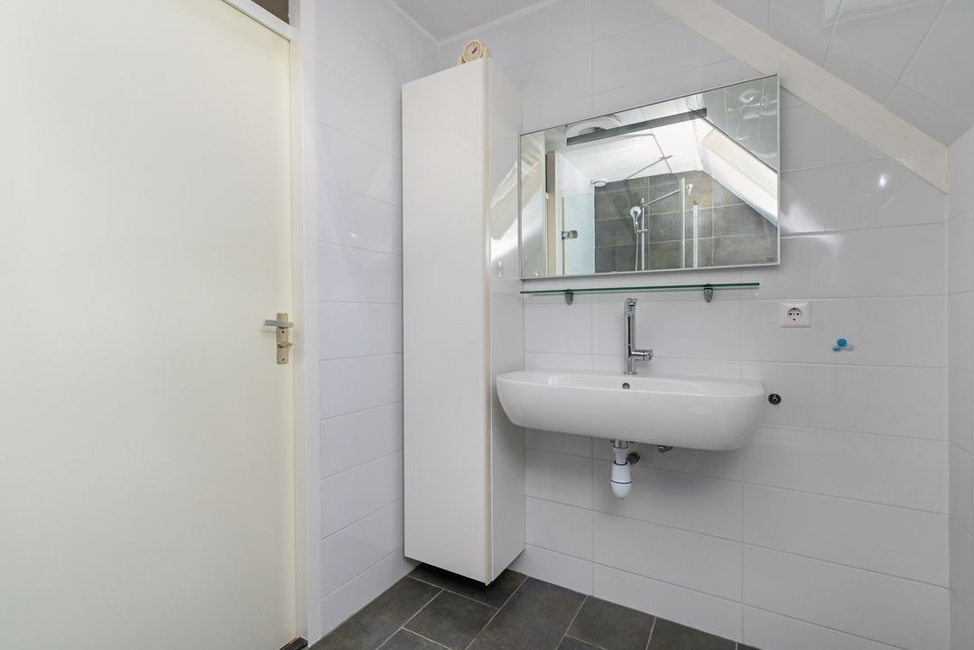 trapopgang naar de 1e verdieping: overloop; achter zijkamer ca. 2,65x3,10m met vaste kast; achter slaapkamer ca. 3,05x4,10m; voor slaapkamer ca. 3,05x3,50m voorzien van een dakkapel; geheel betegelde badkamer ca. 1,70x2,55m voorzien van een douche, brede wastafel, vrijdragend closet, handdoekradiator en Velux dakraam.