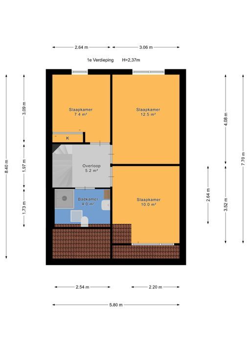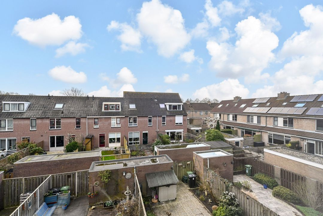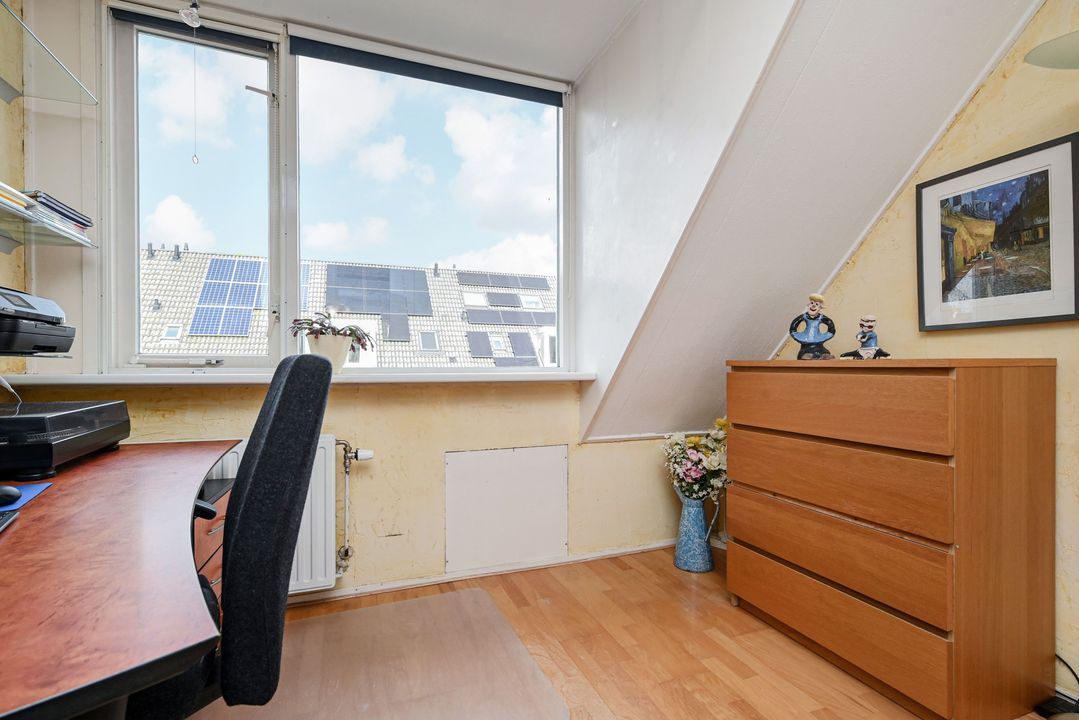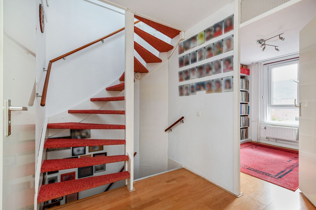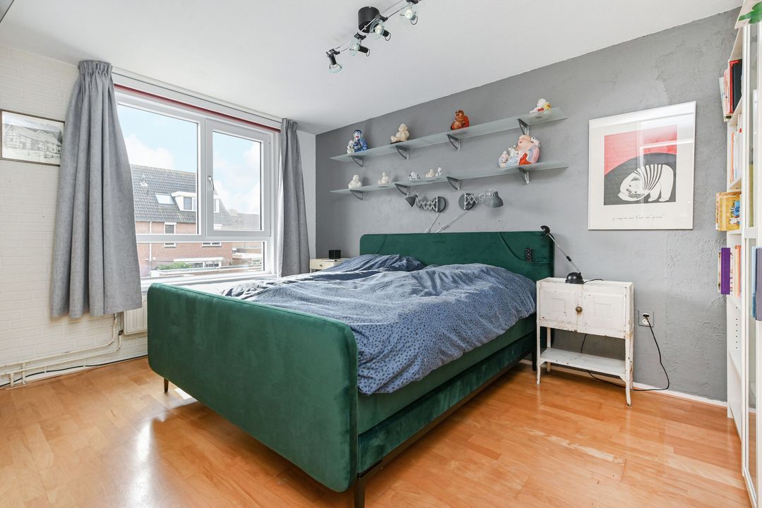trapopgang naar de 1e verdieping: overloop; achter zijkamer ca. 2,65x3,10m met vaste kast; achter slaapkamer ca. 3,05x4,10m; voor slaapkamer ca. 3,05x3,50m voorzien van een dakkapel; geheel betegelde badkamer ca. 1,70x2,55m voorzien van een douche, brede wastafel, vrijdragend closet, handdoekradiator en Velux dakraam.