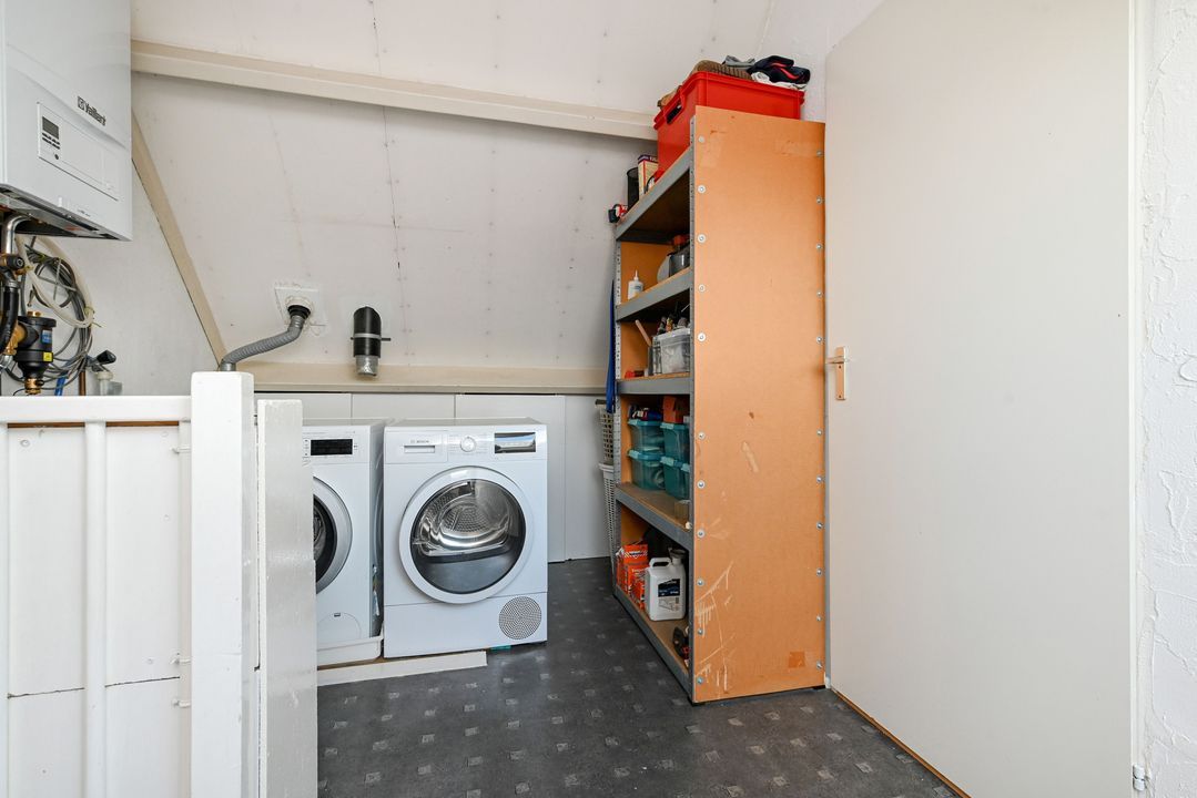 trapopgang naar 2e verdieping: overloop met opstelling cv-combiketel (Vaillant ecoTec classic 2023), mechanische ventilatie (buiten werking), wasmachine, droger en Velux dakraam; slaapkamer ca. 3,35x4,10m voorzien van dakkapel aan de achterzijde (2025) en vliering.